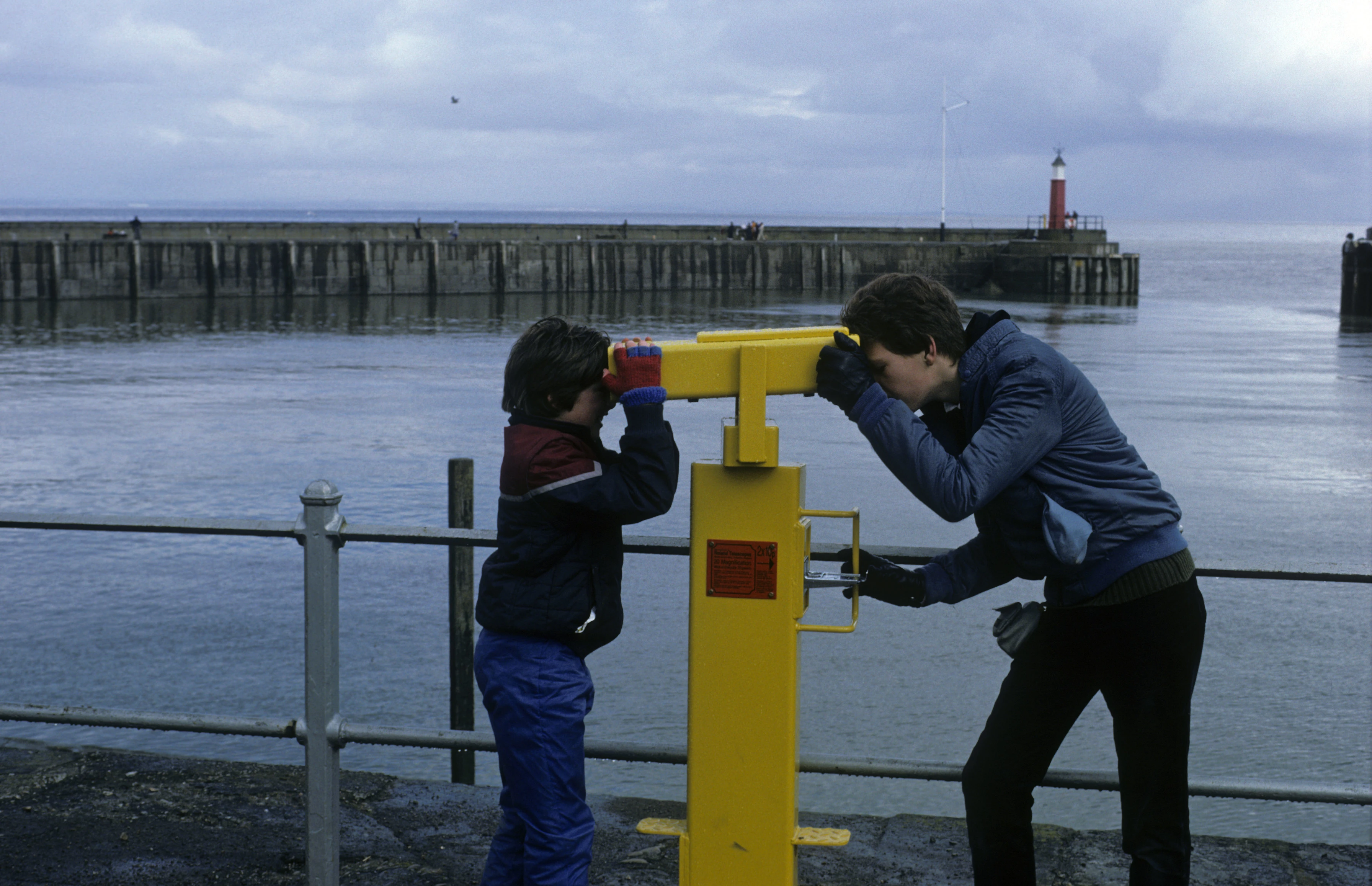 Philip and Jonothan peer at each other through the yellow harbour binoculars at Watchet after our cafe stop.