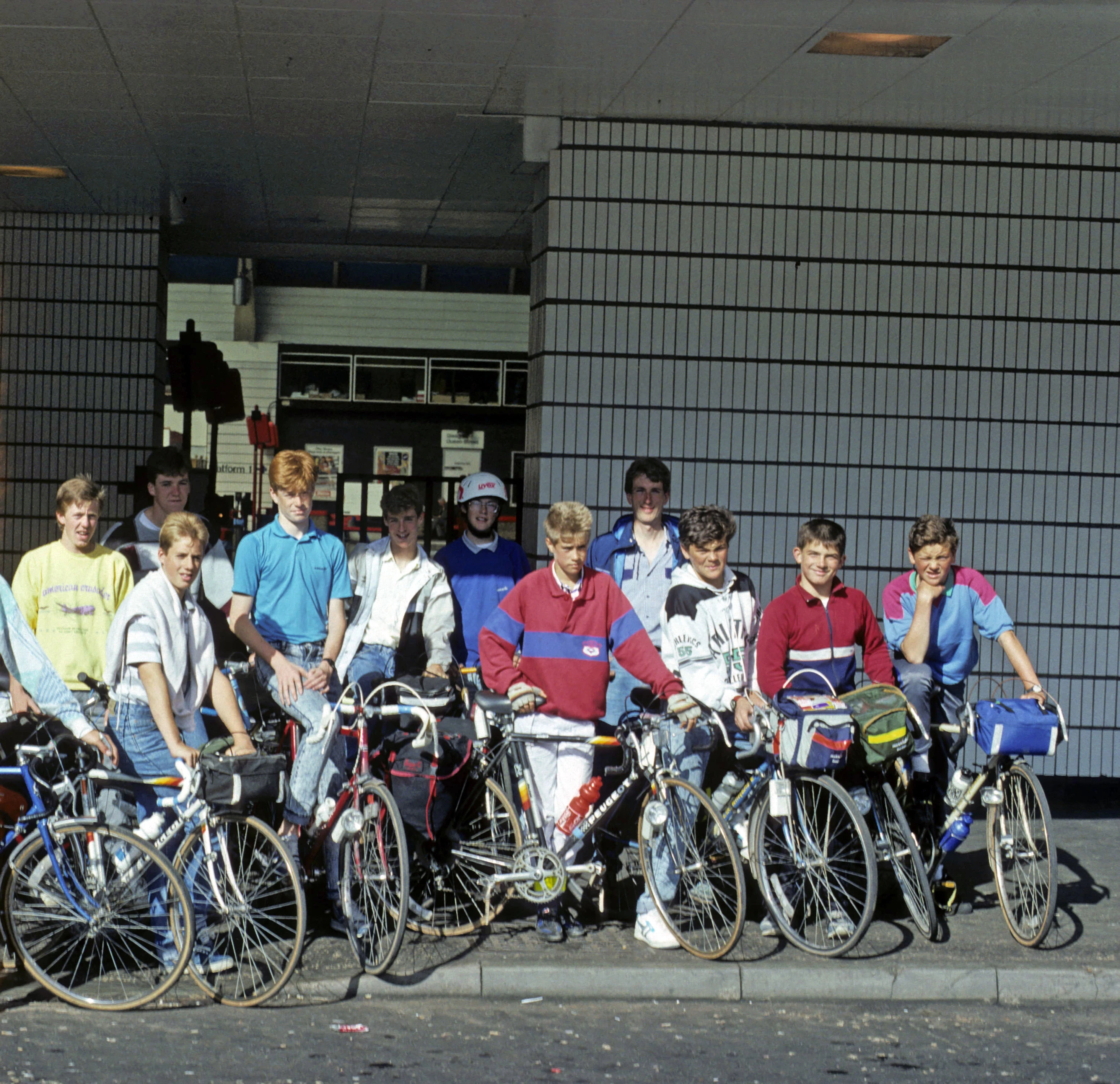 The group ready to roll outside Salcombe Youth Hostel. Richard, Mark, Martyn, Luke, Mark L, Paul and Mark S.