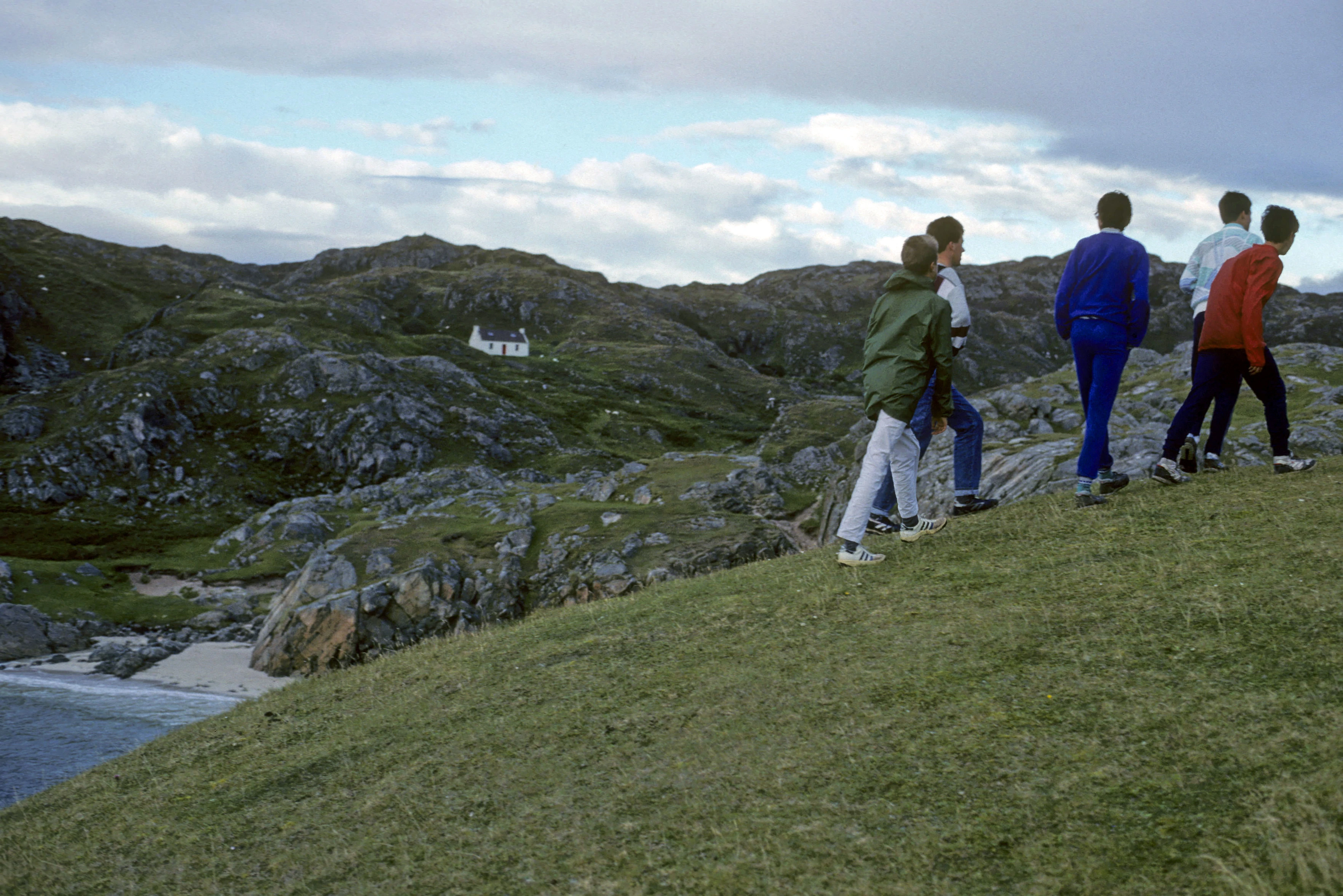 Five of us on the grassy headland between Achmelvich’s two silver‑sand beaches; Vesteys Beach behind.