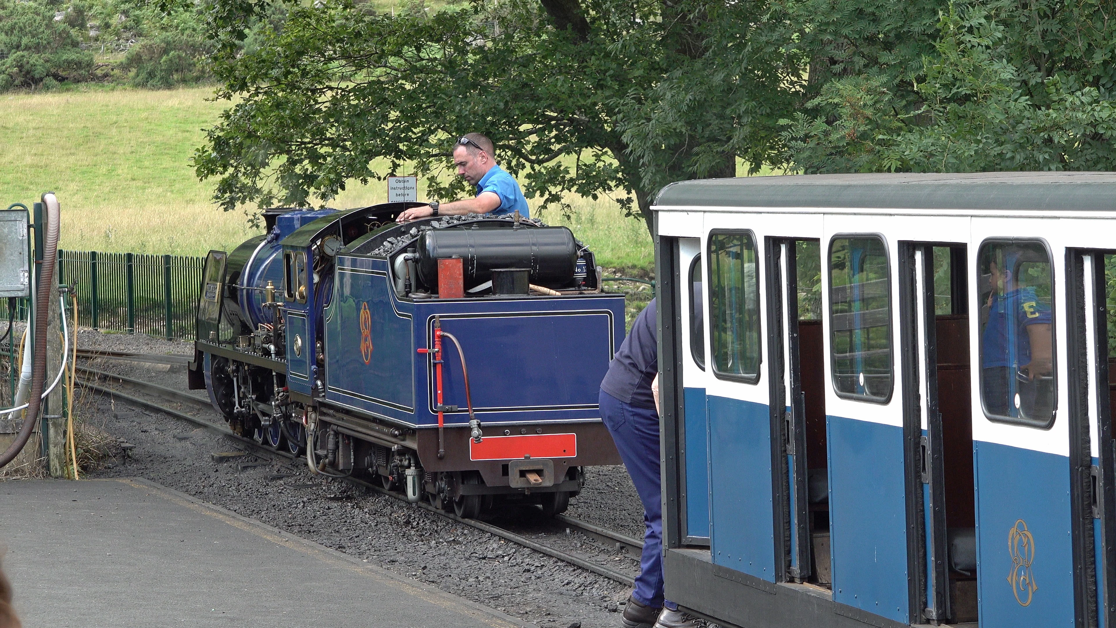 The miniature steam engine couples to the train at Dalegarth Station.