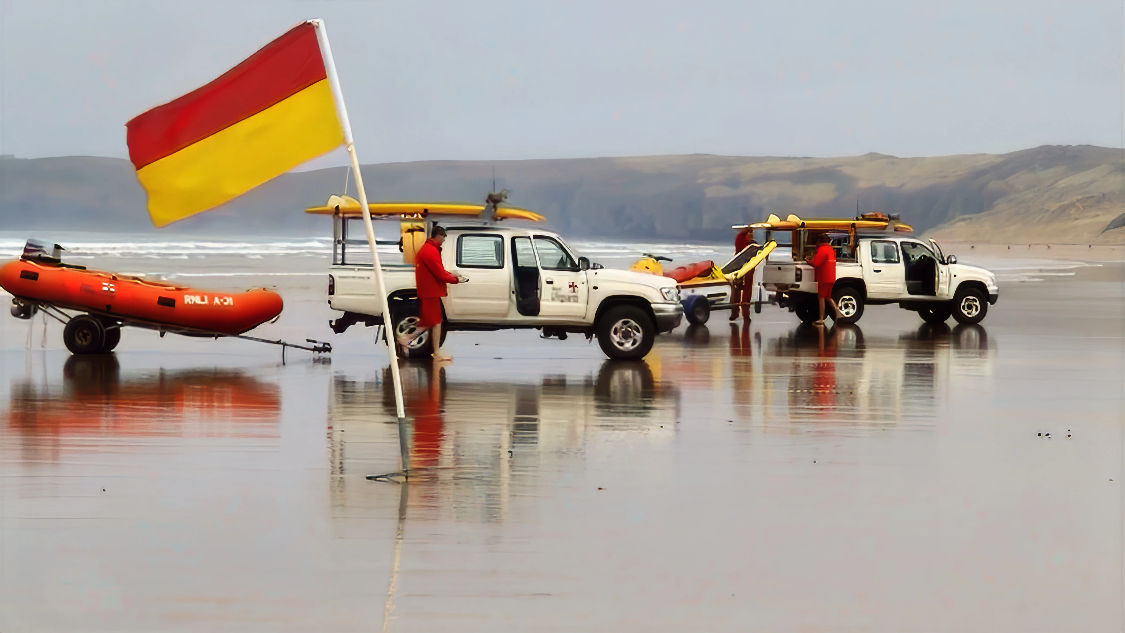 Lifeguards on Perranporth Beach, shuffling along with the tide.