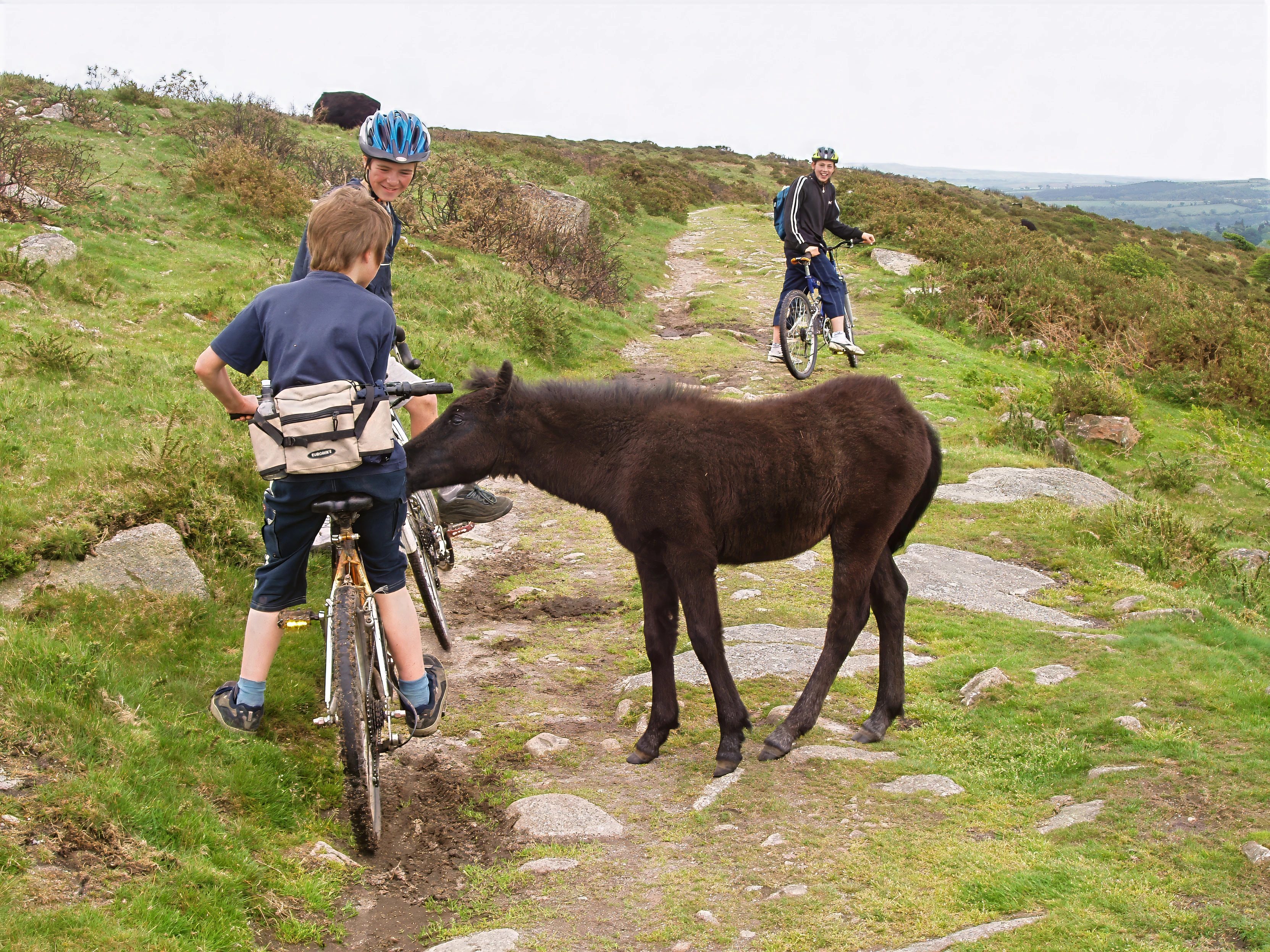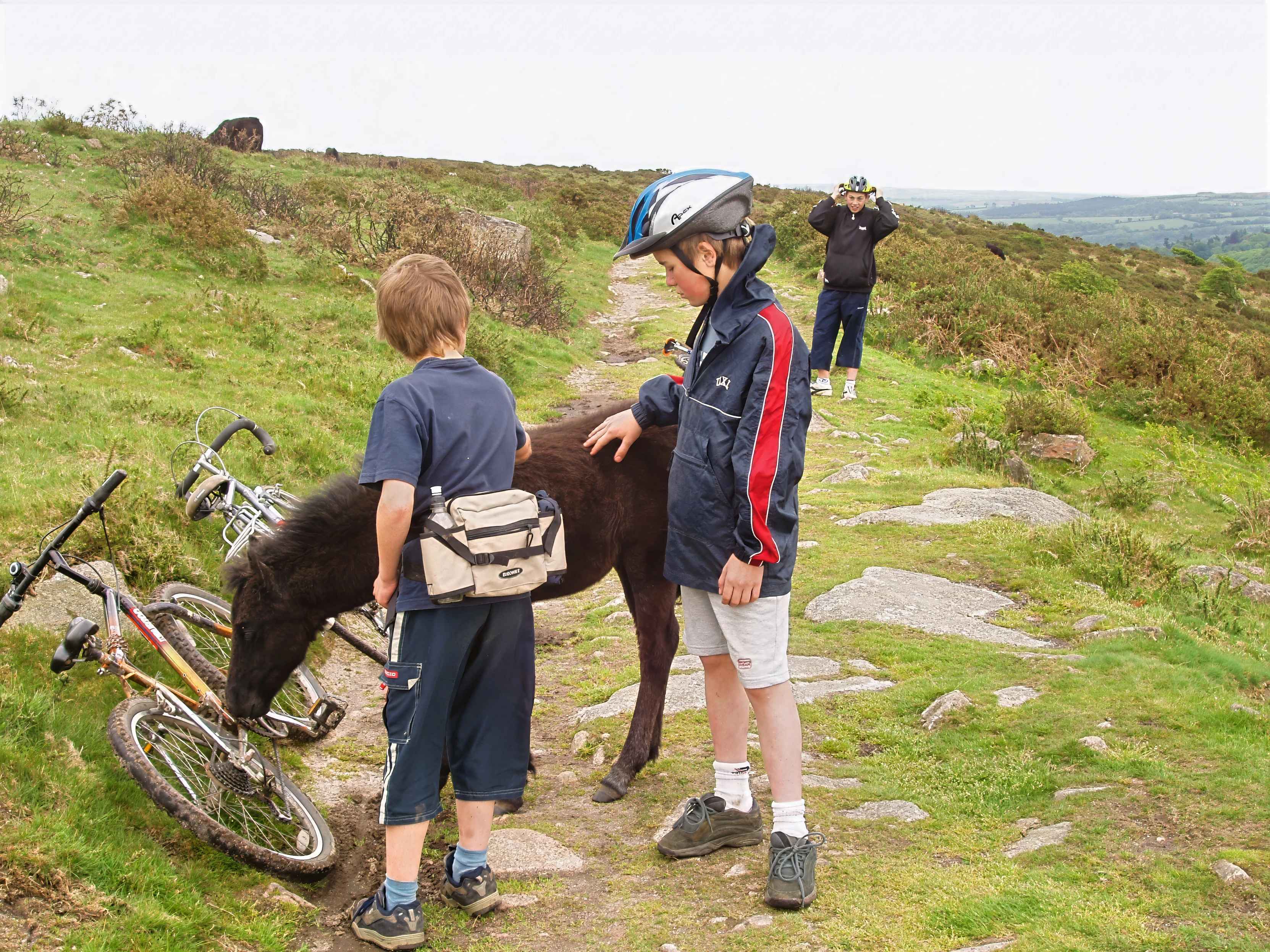 A Dartmoor pony takes a keen interest in Dennis's bike on Dr Blackall's Drive.