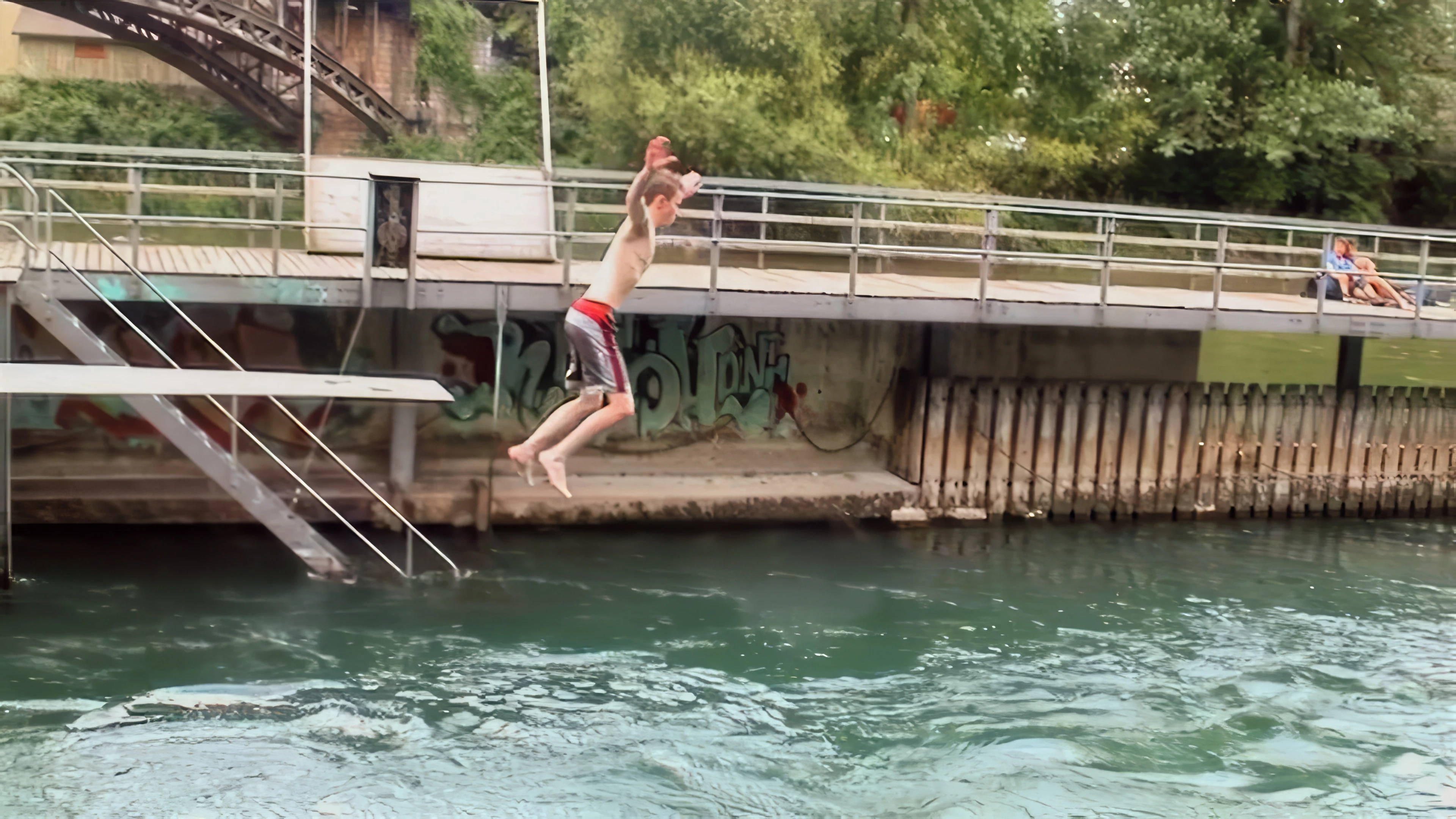 Local children jumping and diving at Aue Sports Centre, Baden, beside Route 5, 9.4 miles in.
