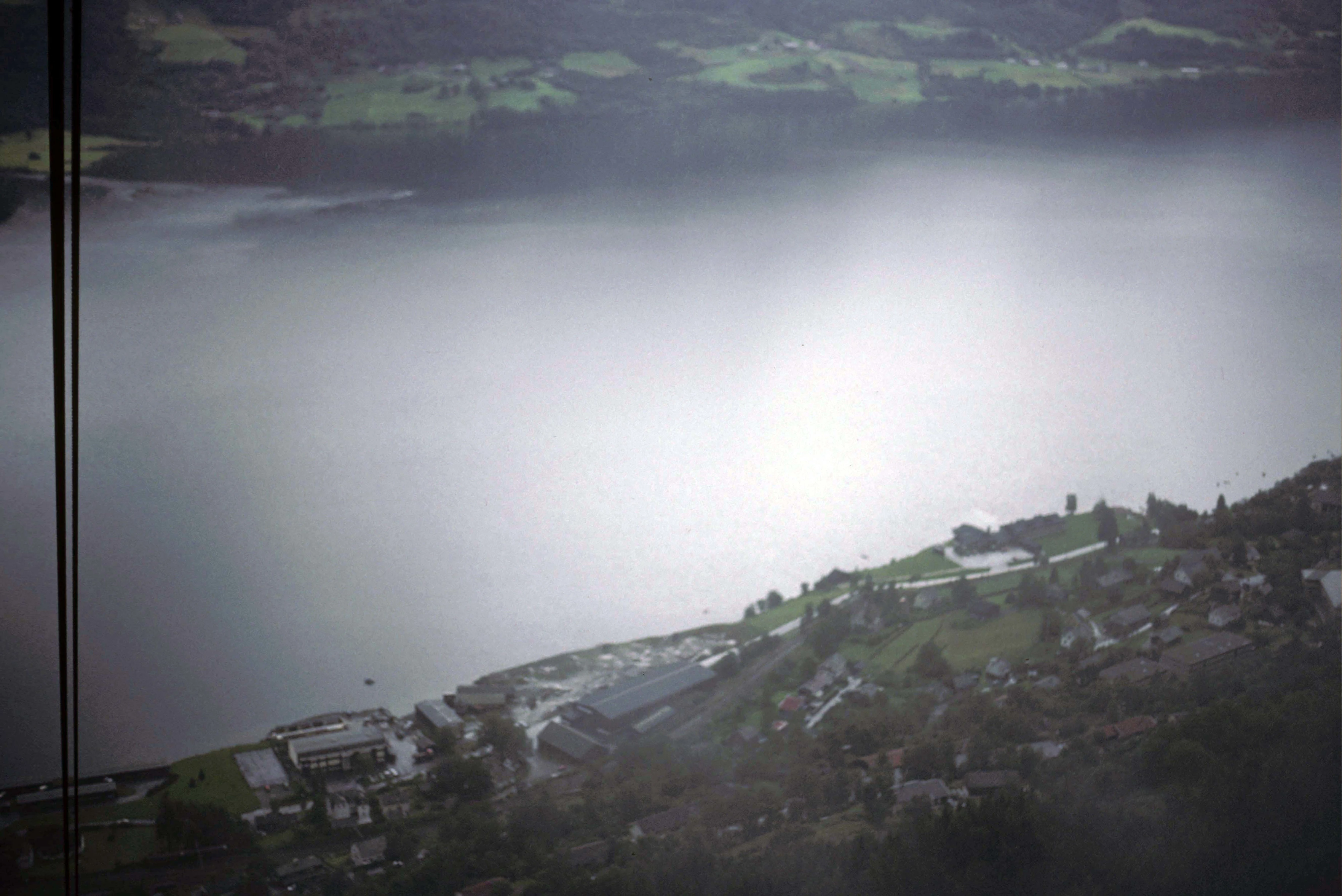 Voss Youth Hostel on the edge of Vangsvatnet, from the Hangursbanen.