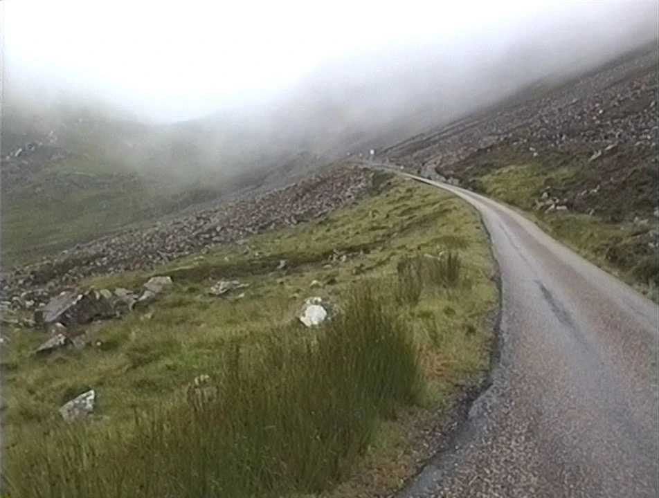 Road climbs into the clouds to Bealach na Ba (Pass of the Cattle), seen from 318 m—about halfway.