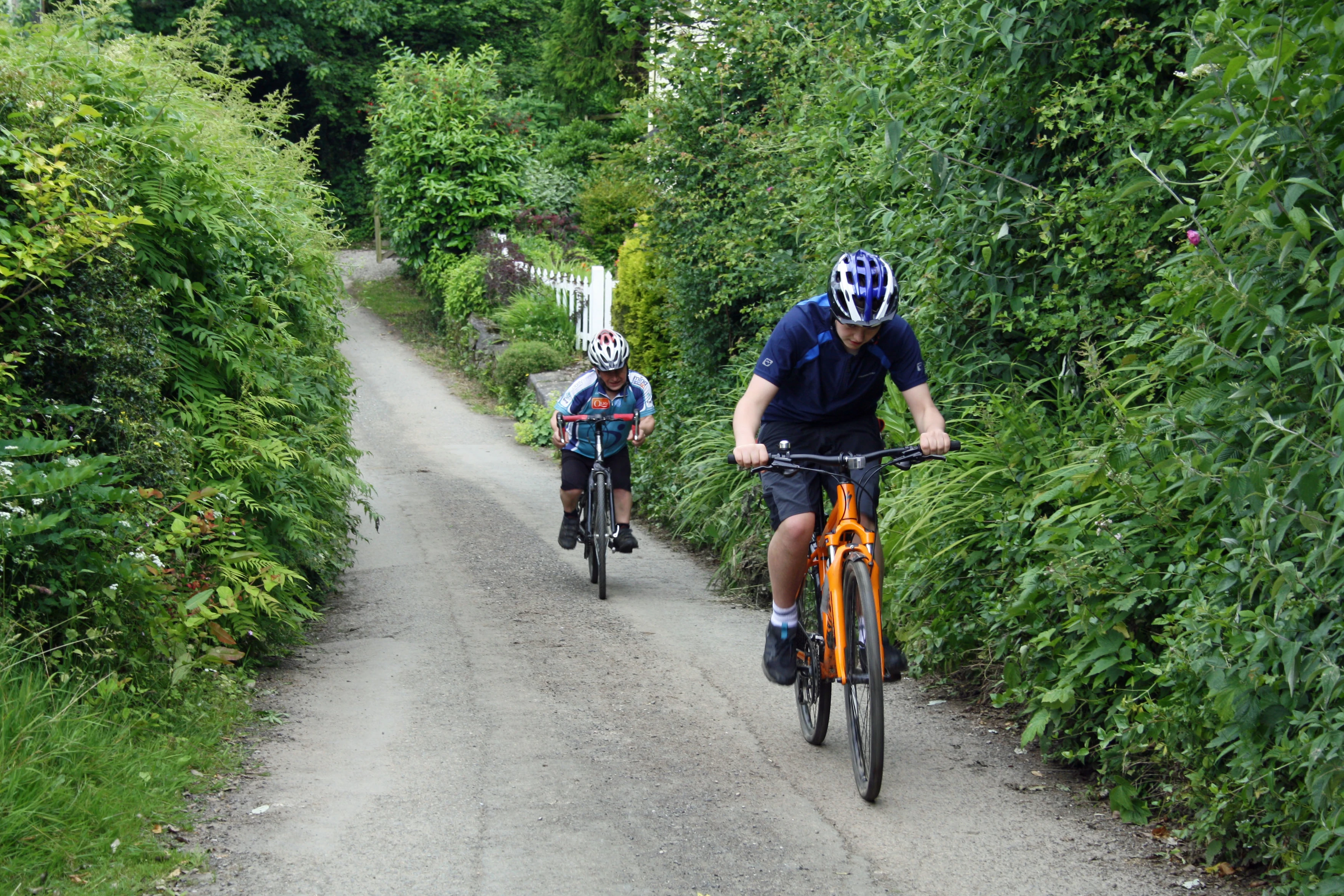Dillan and John riding towards Week, Dartington, from Westcombe.