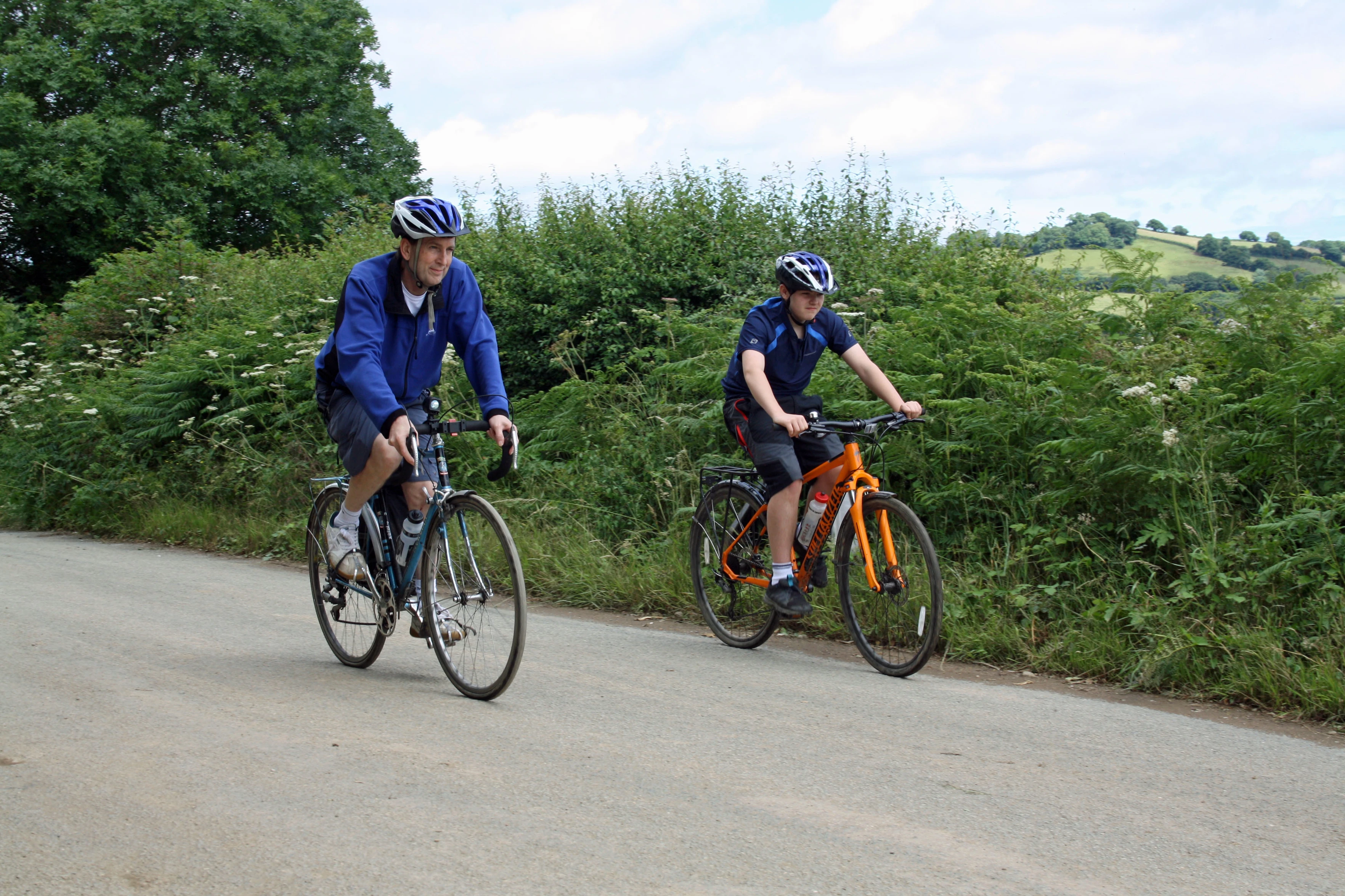 Michael back on his bike at last, with Dillan near Tidwell, Landscove