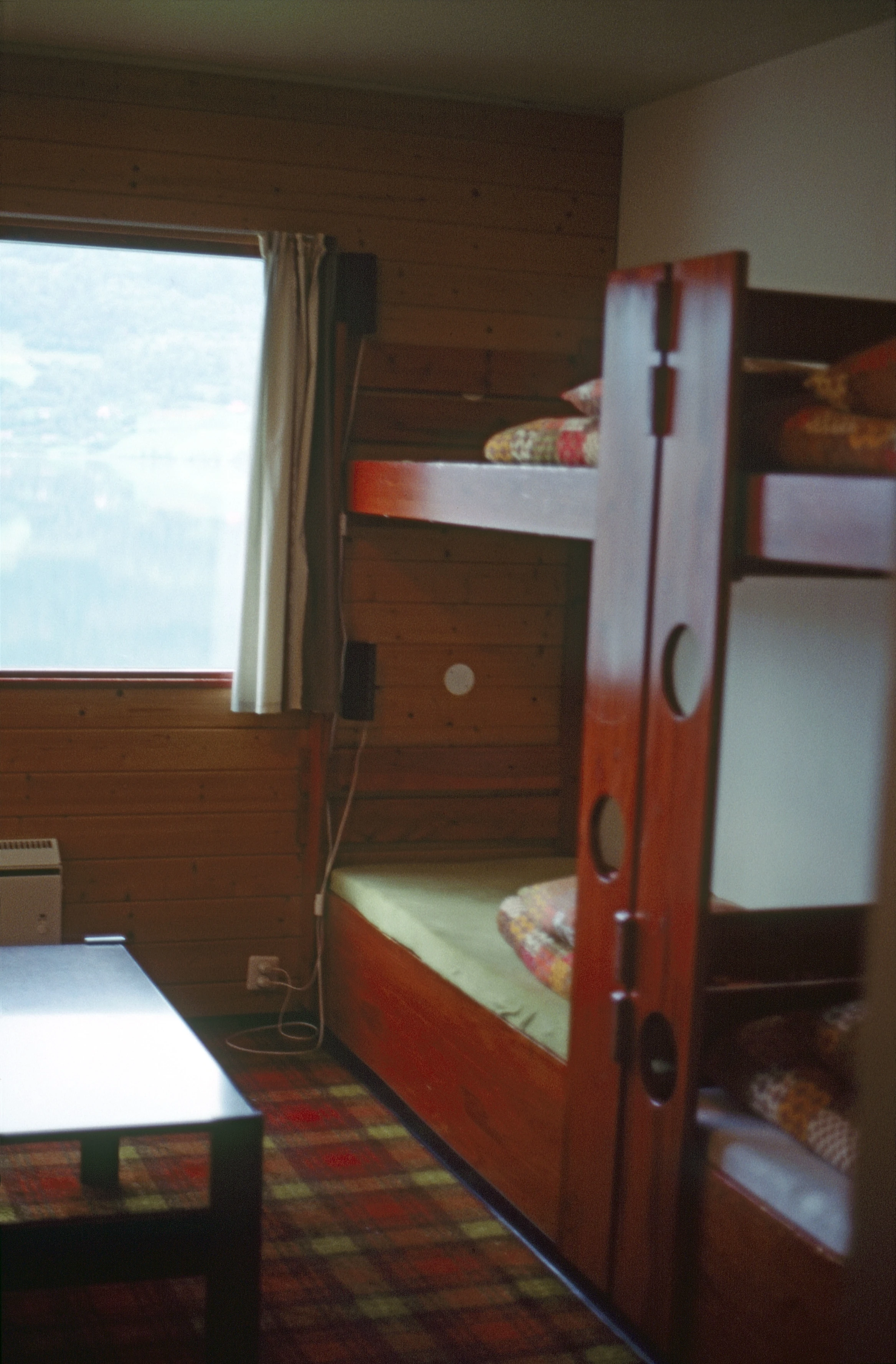 One of our two modern four‑bed bunk rooms at Voss Youth Hostel, overlooking the lake. Stylish circular holes replace ladders.