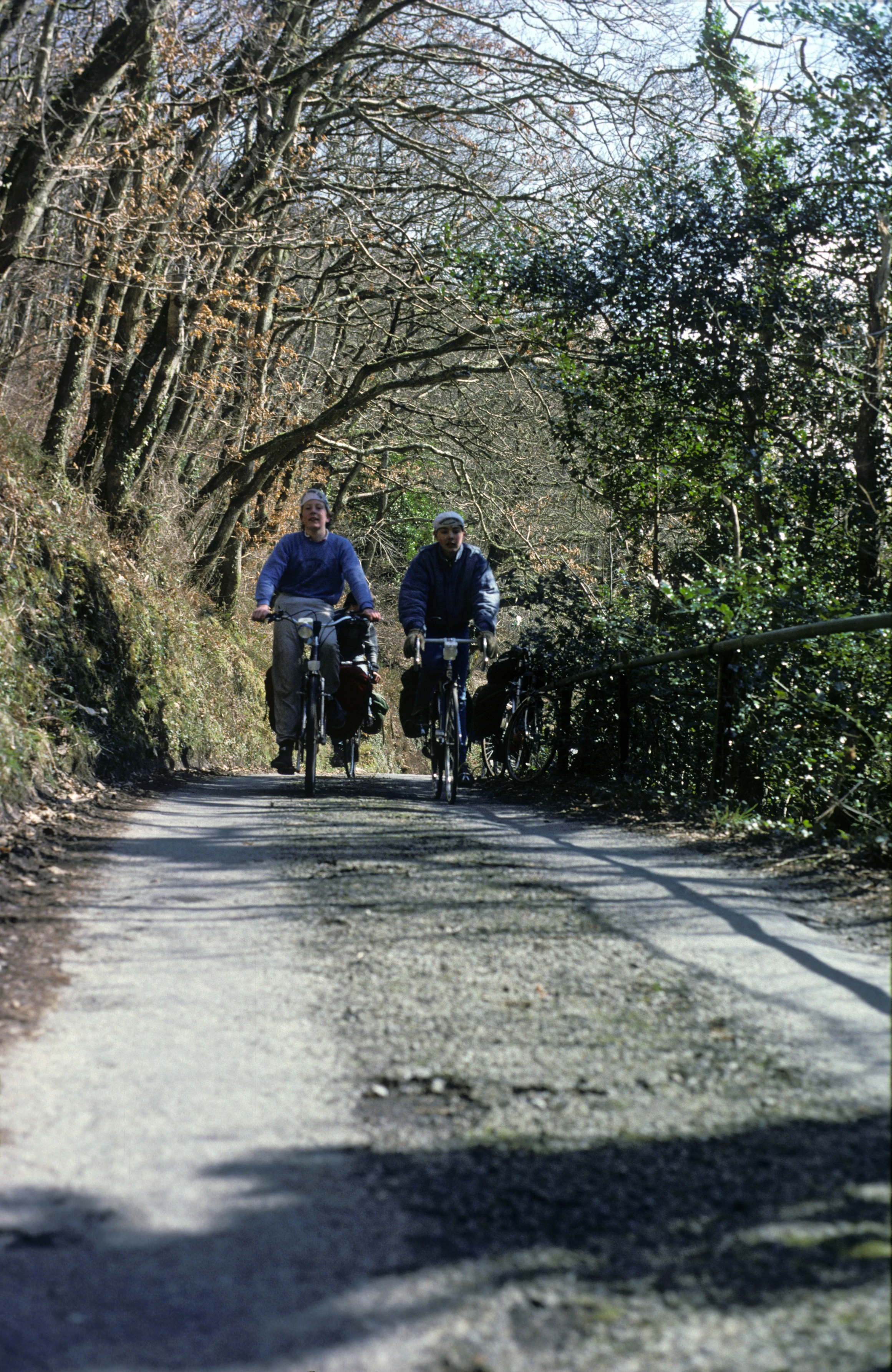 Andrew Simmons and David Parry lead the way down Broadoak Hill towards Hunters’ Inn through spring woodland.