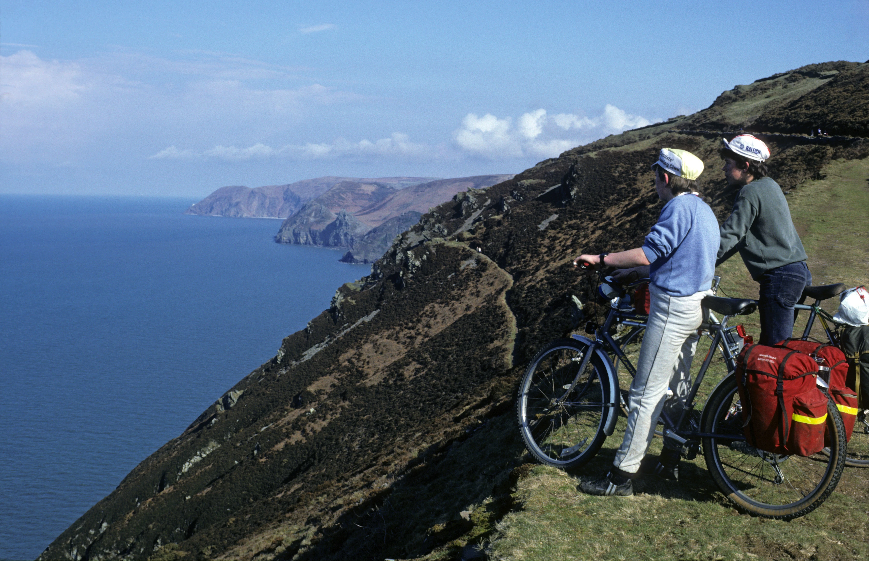 Andrew Simmons and Graham Moates take in the lofty view towards Lynton and Foreland Point above Highveer Point.