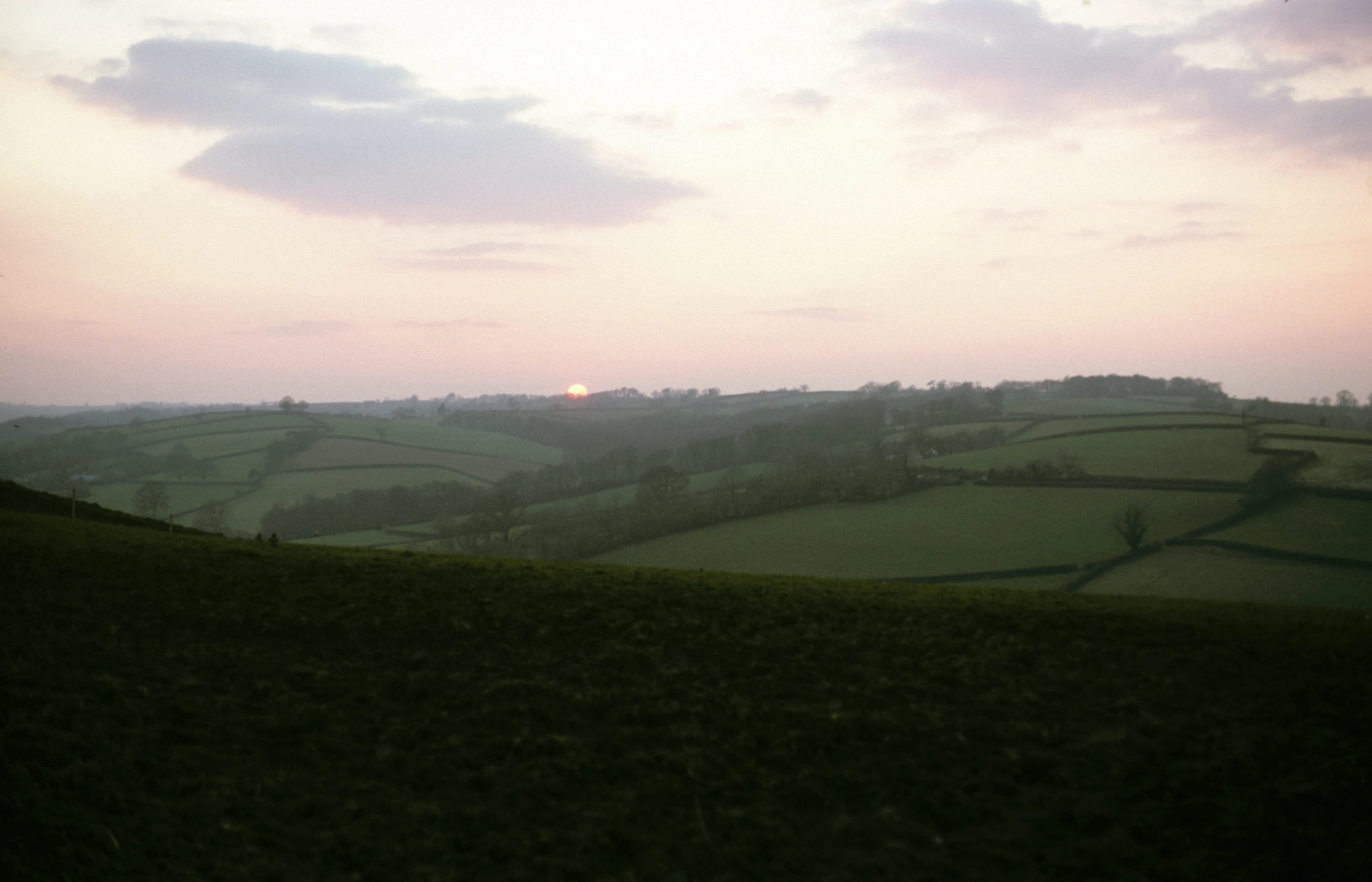 Sunset over the rolling hills near Hittisleigh as the day's light fades.