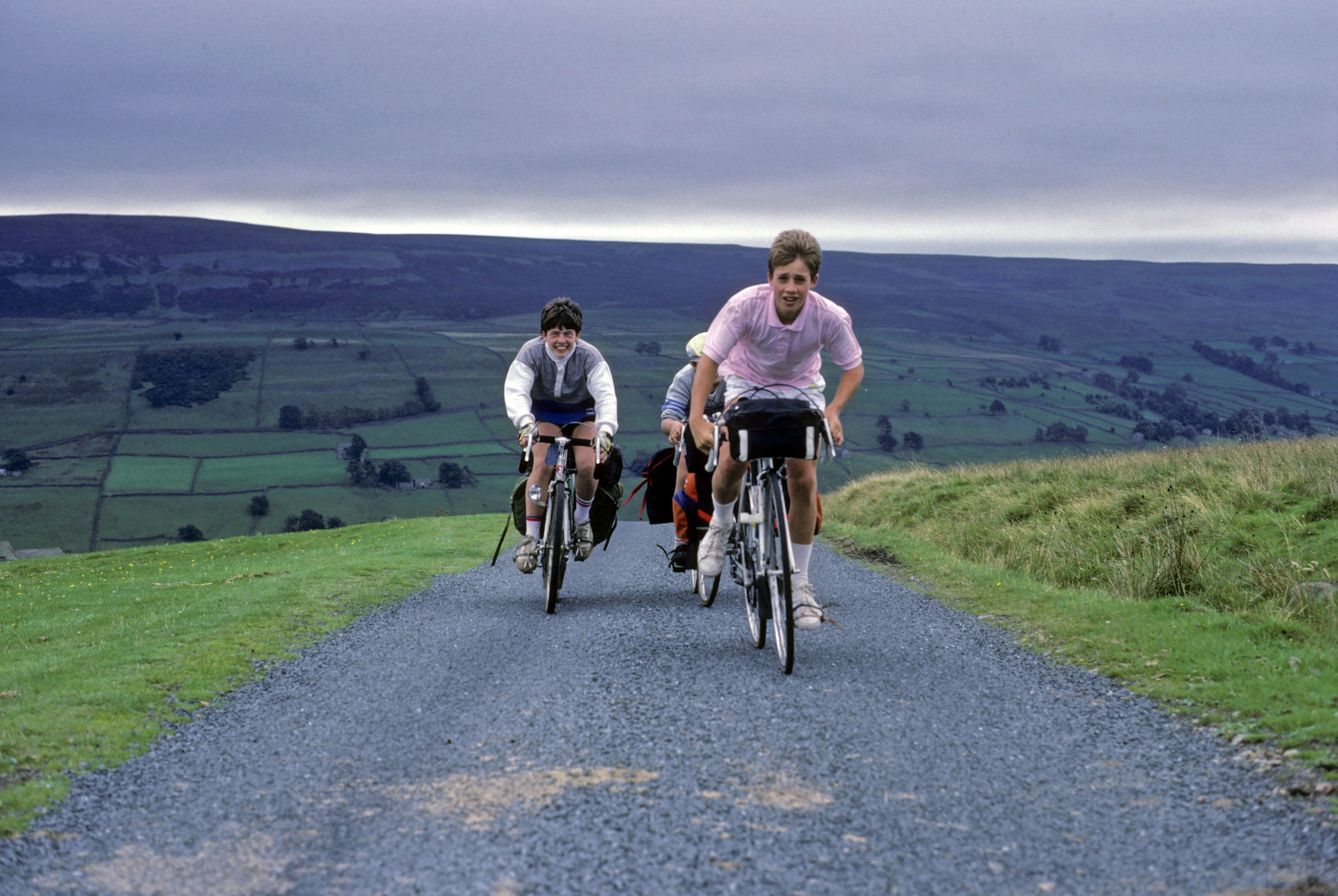 Gary and Brett push on over Feetham Pasture, Swaledale moody under heavy cloud.