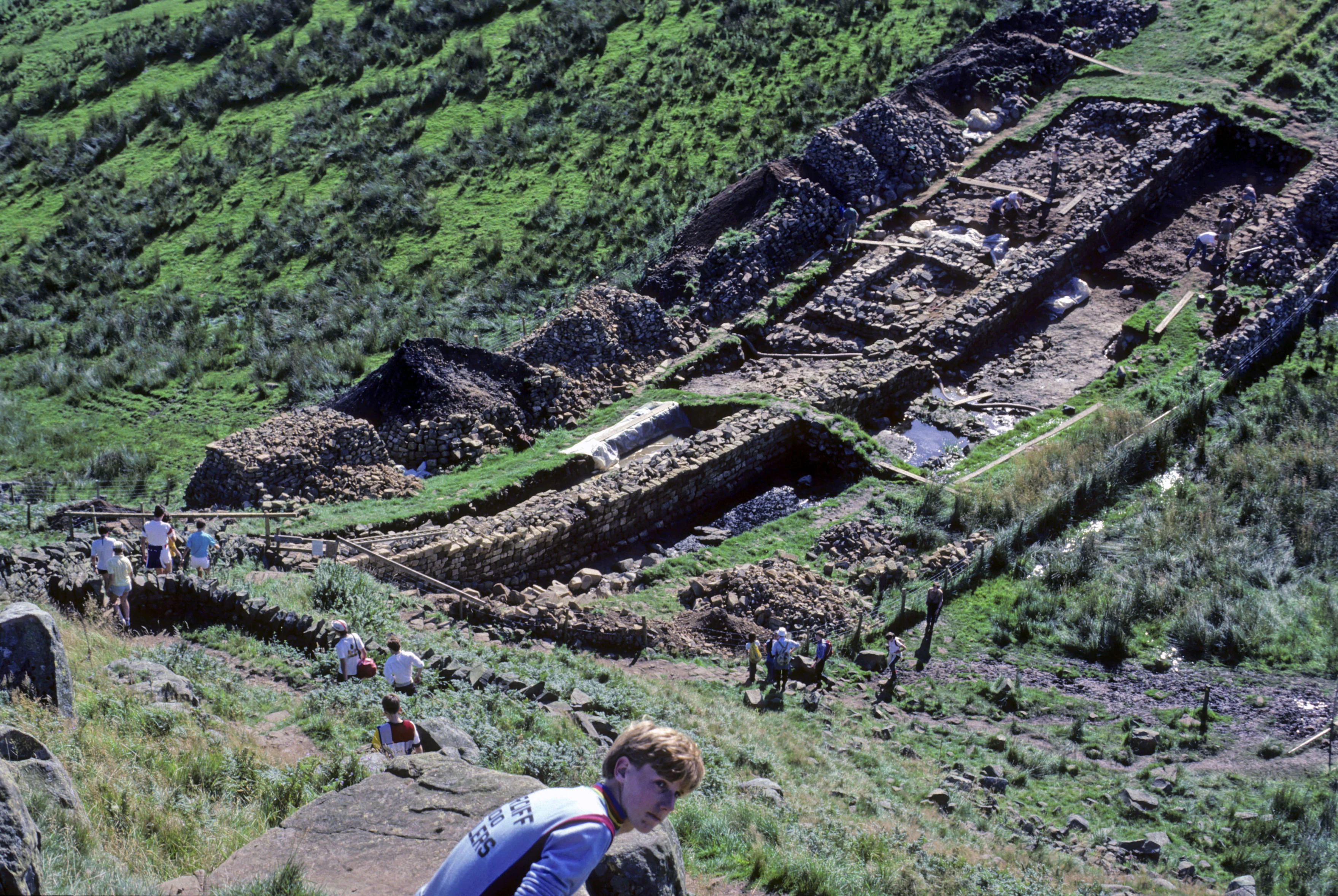 Archaeological dig beside Hadrian’s Wall near Once Brewed, revealing buried Roman masonry.