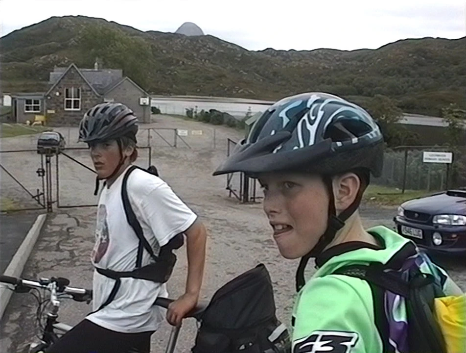 Luke and Dominic at Lochinver Primary, almost surrounded by Loch Culag.