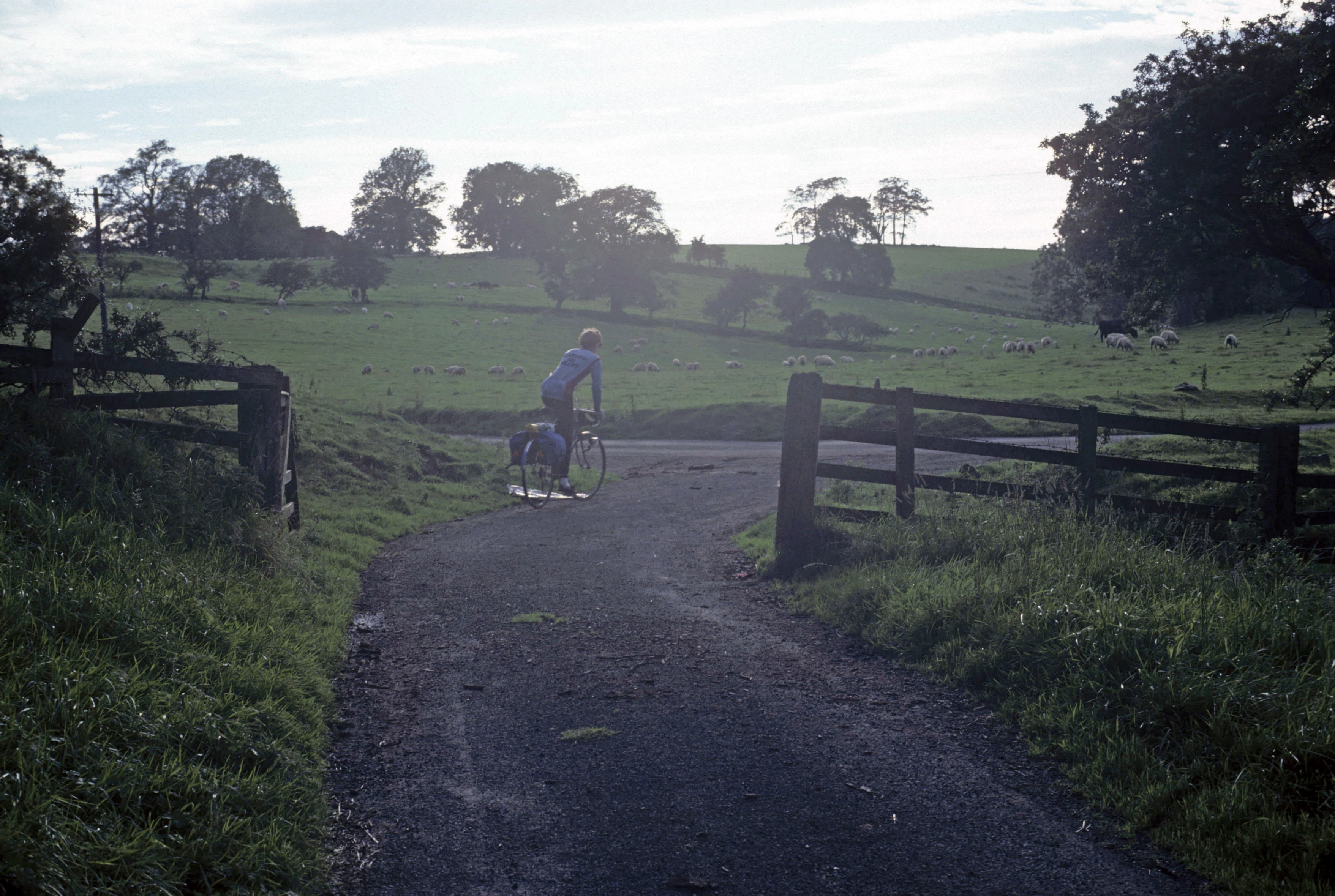Jeff rolls through a gated lane towards Simonburn in the evening light.
