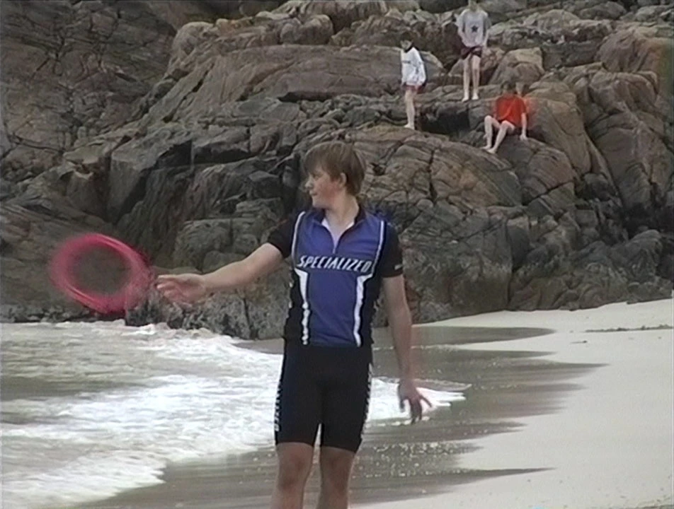 Gavin launches the Aerobie on Achmelvich Beach—minutes before a jellyfish gets him.