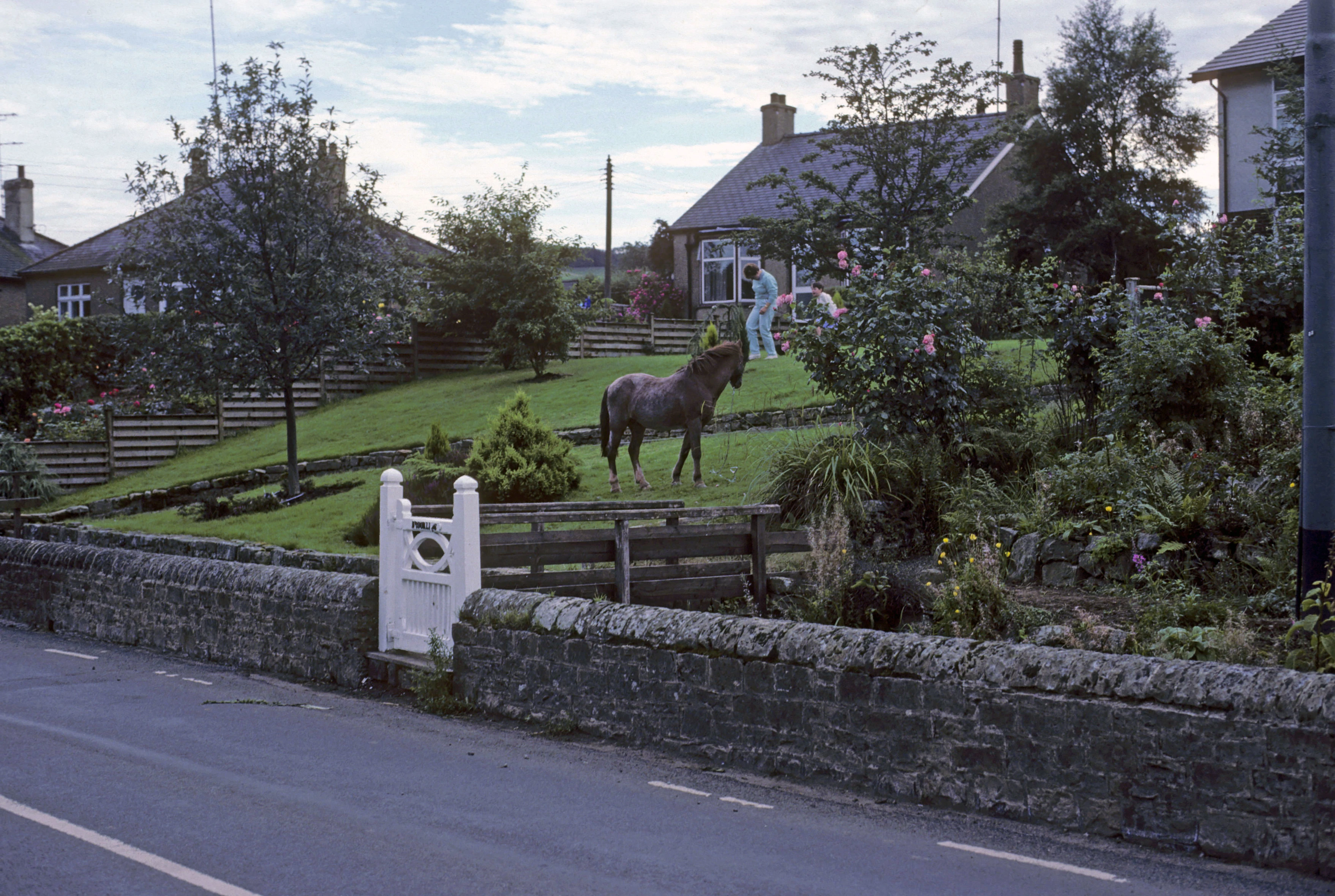 An unusually domesticated scene: a tethered horse grazing a bungalow’s front lawn in Wark.