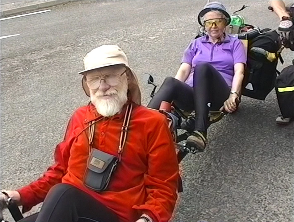 Jolly recumbent tandem duo chatting at North Kessock, a few miles from Inverness