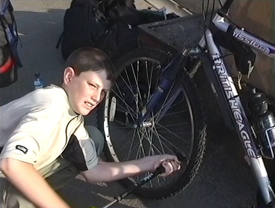Dominic pumps his tyres at Euston, London.