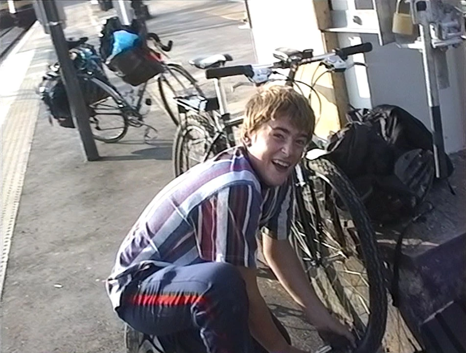 Luke pumps at Euston; he deflated his thick, chunky tyres last night to fit the train’s bike rack.