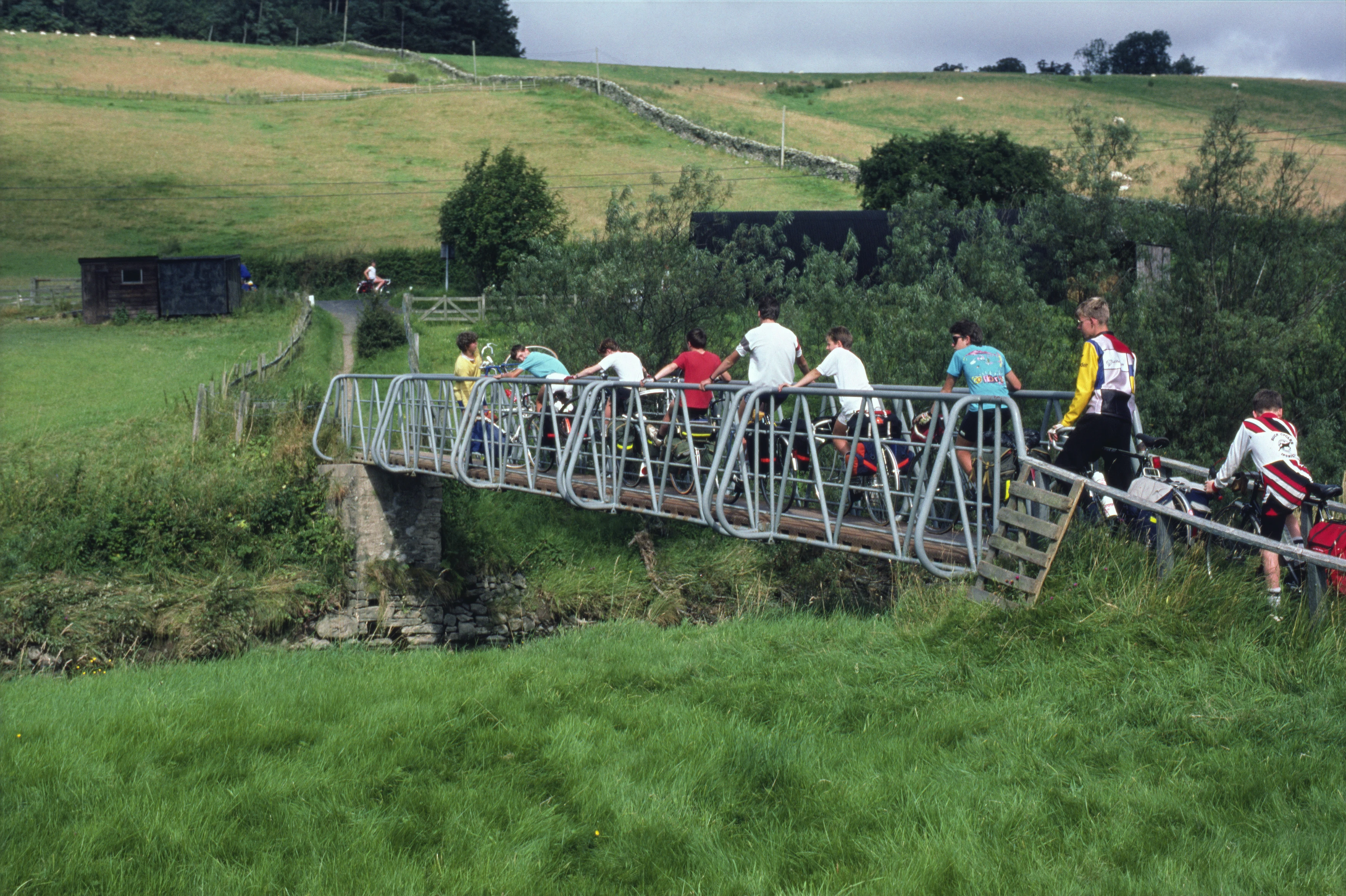 Crossing the Borthwick Water footbridge from Snoot’s meadow, heaving touring bikes back to the road.