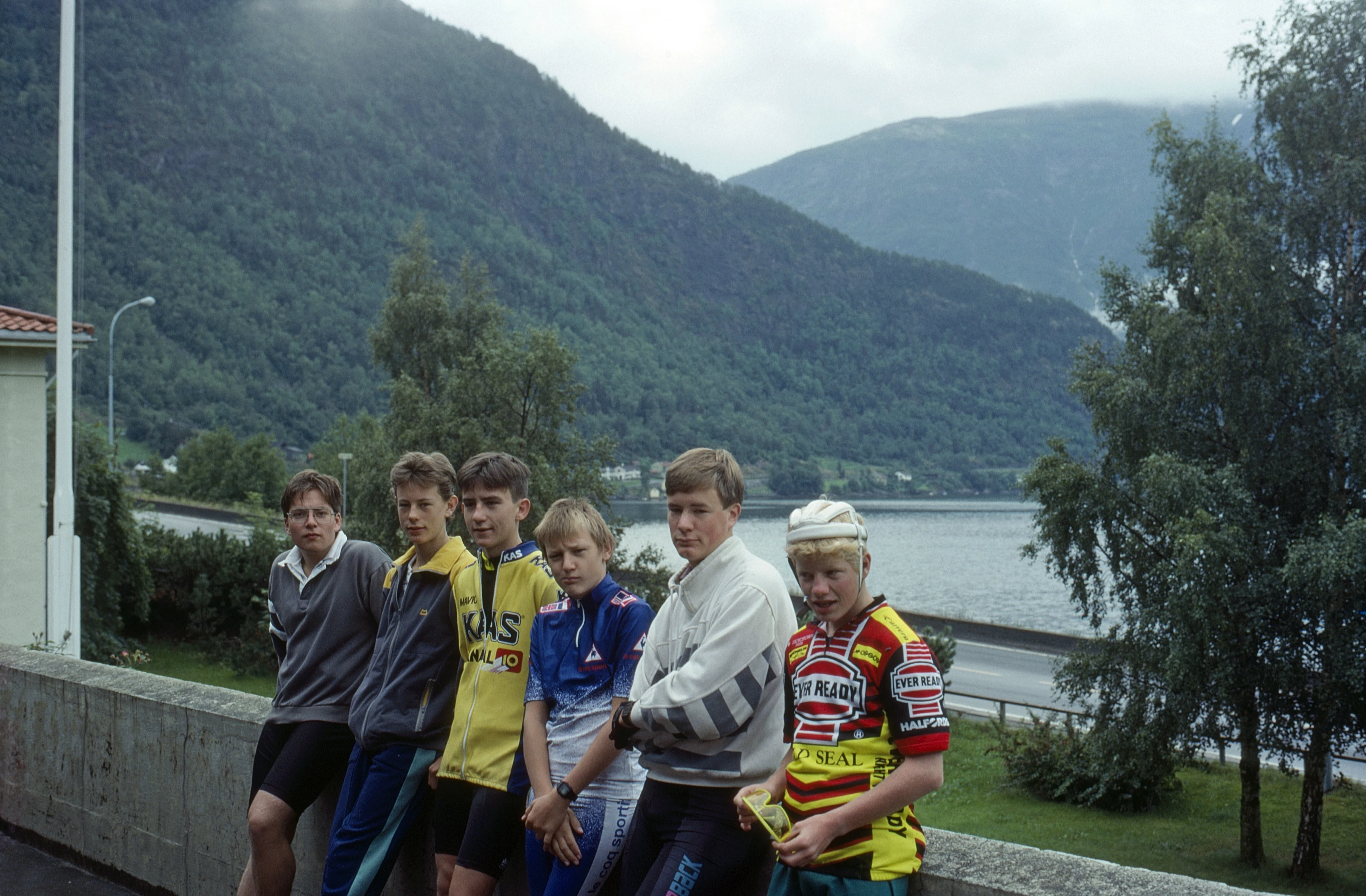 Mark Moxham, Peter Rushworth, Mark Burnard, Shane Powell, Mark Sloman, Ian Luke. On the wall by Sogndal hostel, Sognefjord and Helgheimsvehen behind.