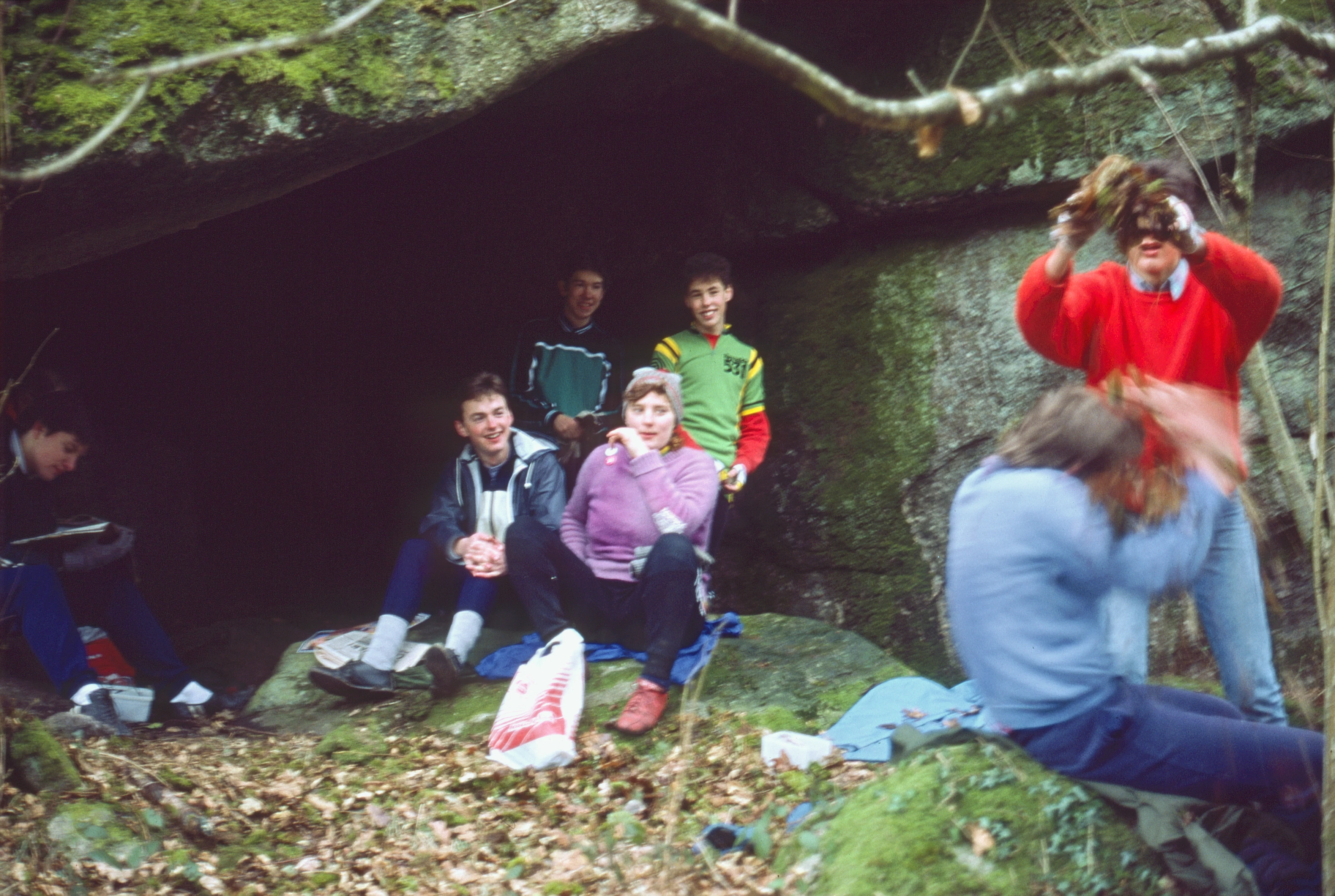 Lunch at the small cave deep in Lustleigh Cleave woods: Jason drops dead leaves on Luke as Martin, Graham, Gabrielle and John watch. Mark shows no interest.