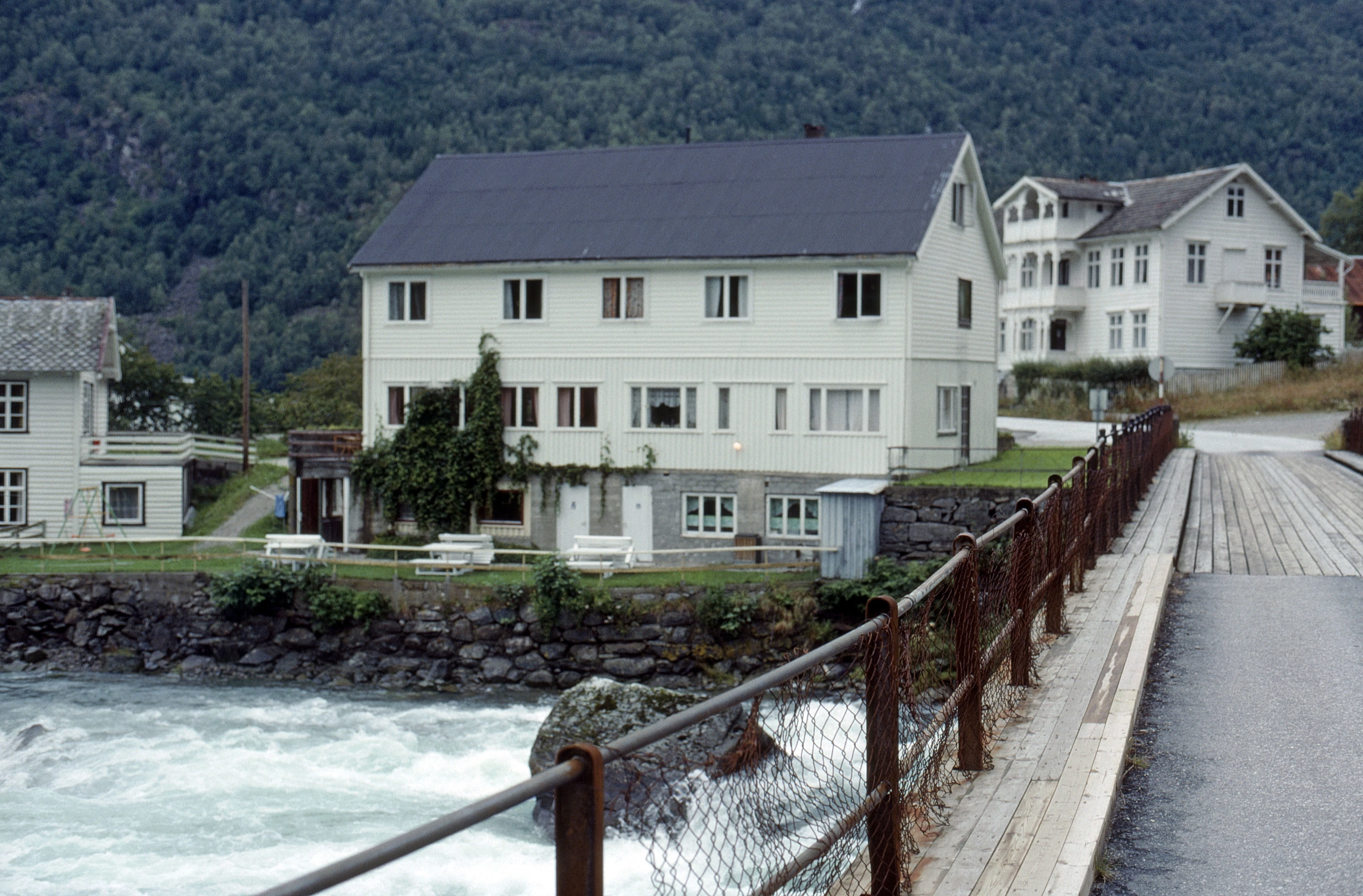Skjolden Youth Hostel from the little bridge over the very noisy Eidselvi.