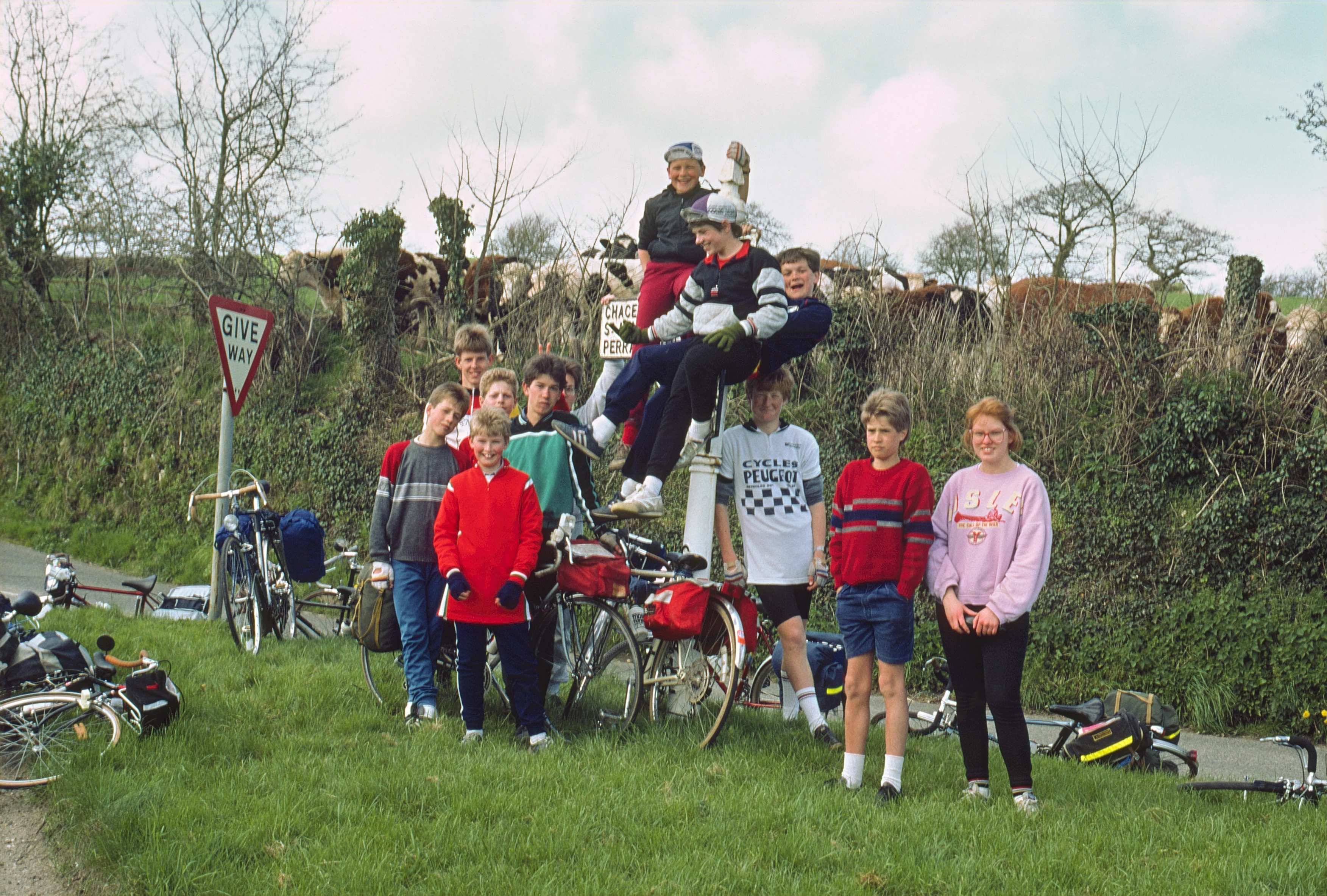 Jason, Gary and Mark Morris on the sign near Higher Carnon Farm, towards Bissoe and Chacewater; others below.