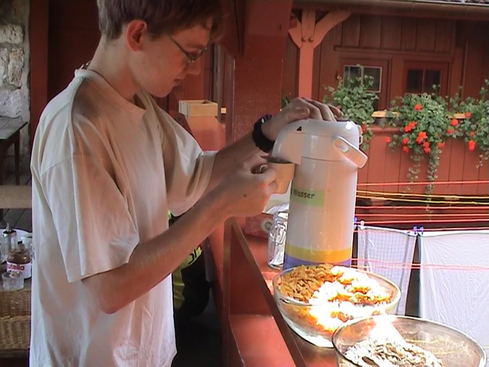Oliver brews his breakfast tea at Mariastein-Rotberg Youth Hostel