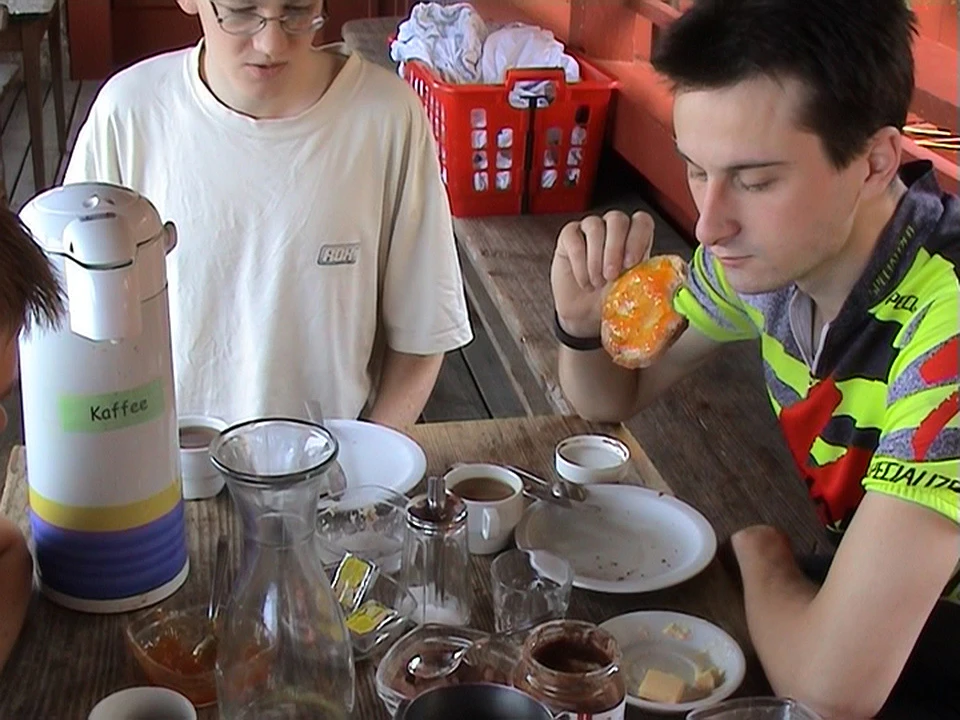 Tao savours Swiss jams at our decidedly late Mariastein-Rotberg hostel breakfast