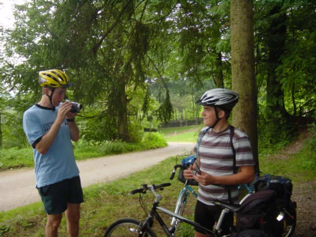 Michael films Luke outside Mariastein-Rotberg Youth Hostel