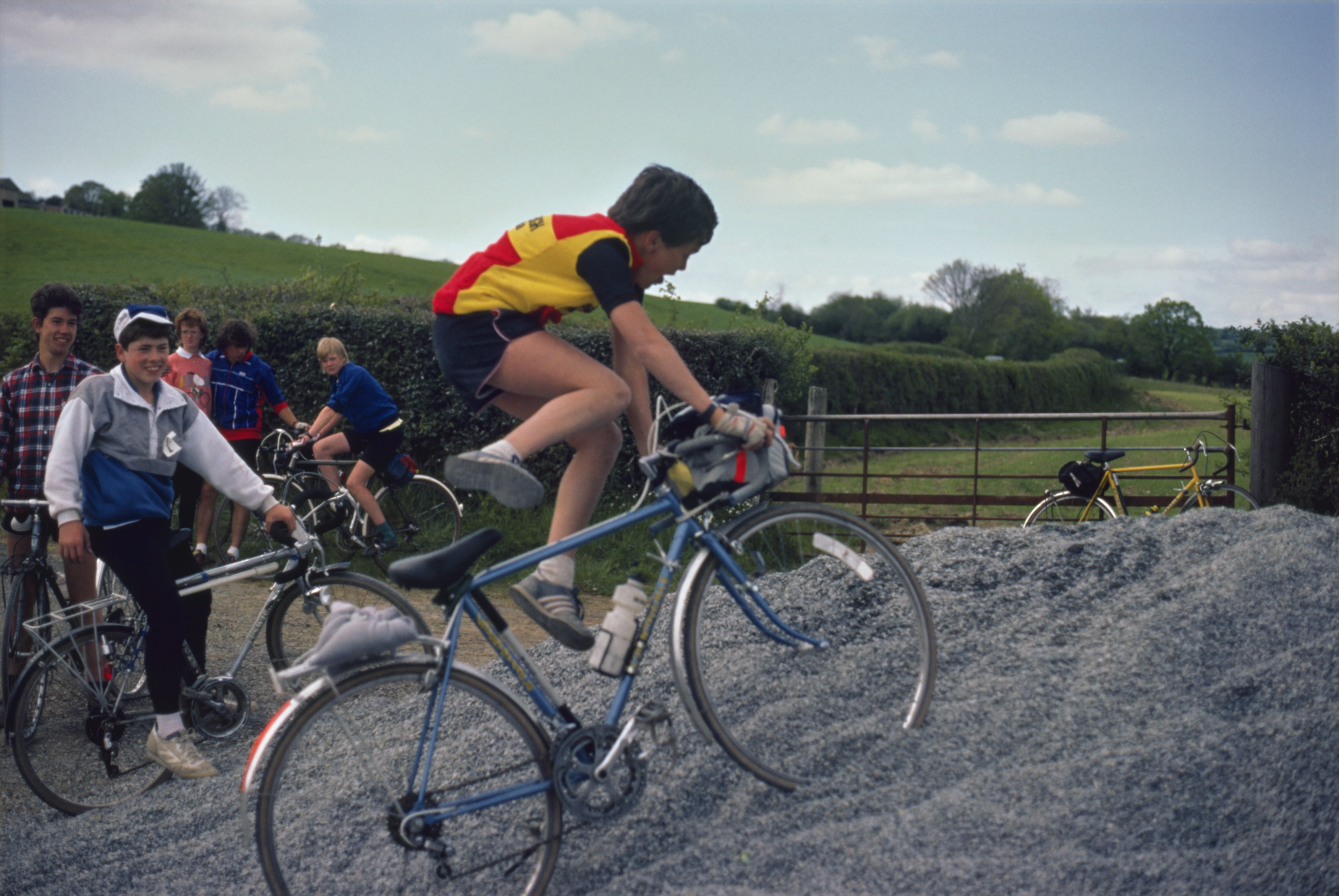 Jason’s run at the start’s gravel pile ends in a bail‑out. Graham, Gary and Torbay Section watch.