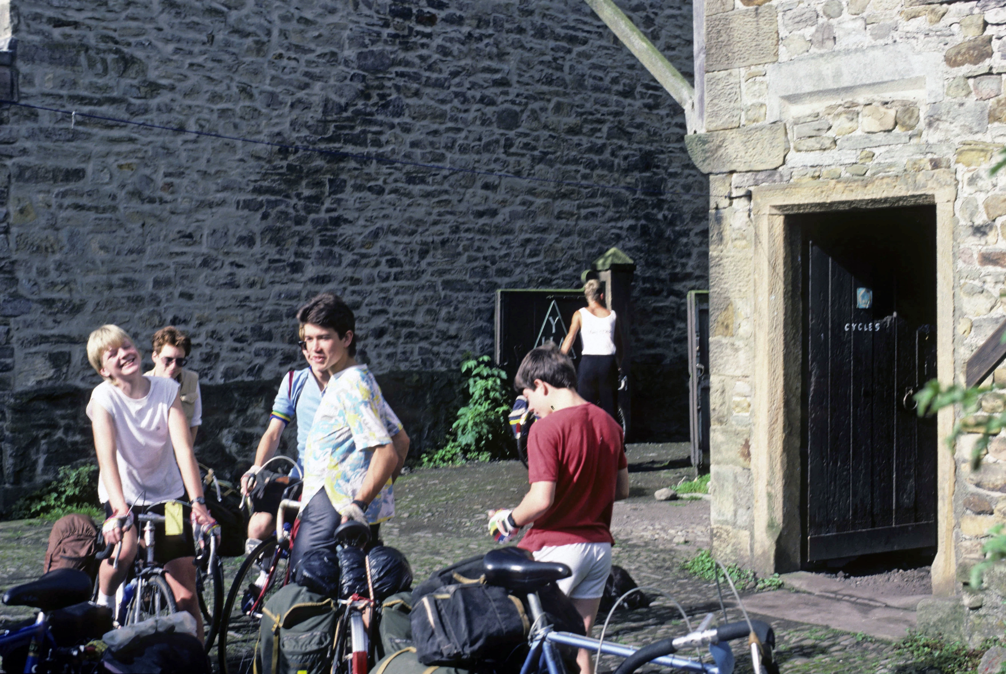 Morning muster in Slaidburn Youth Hostel courtyard, bikes loaded; cycle shed and dormitory steps to the right.