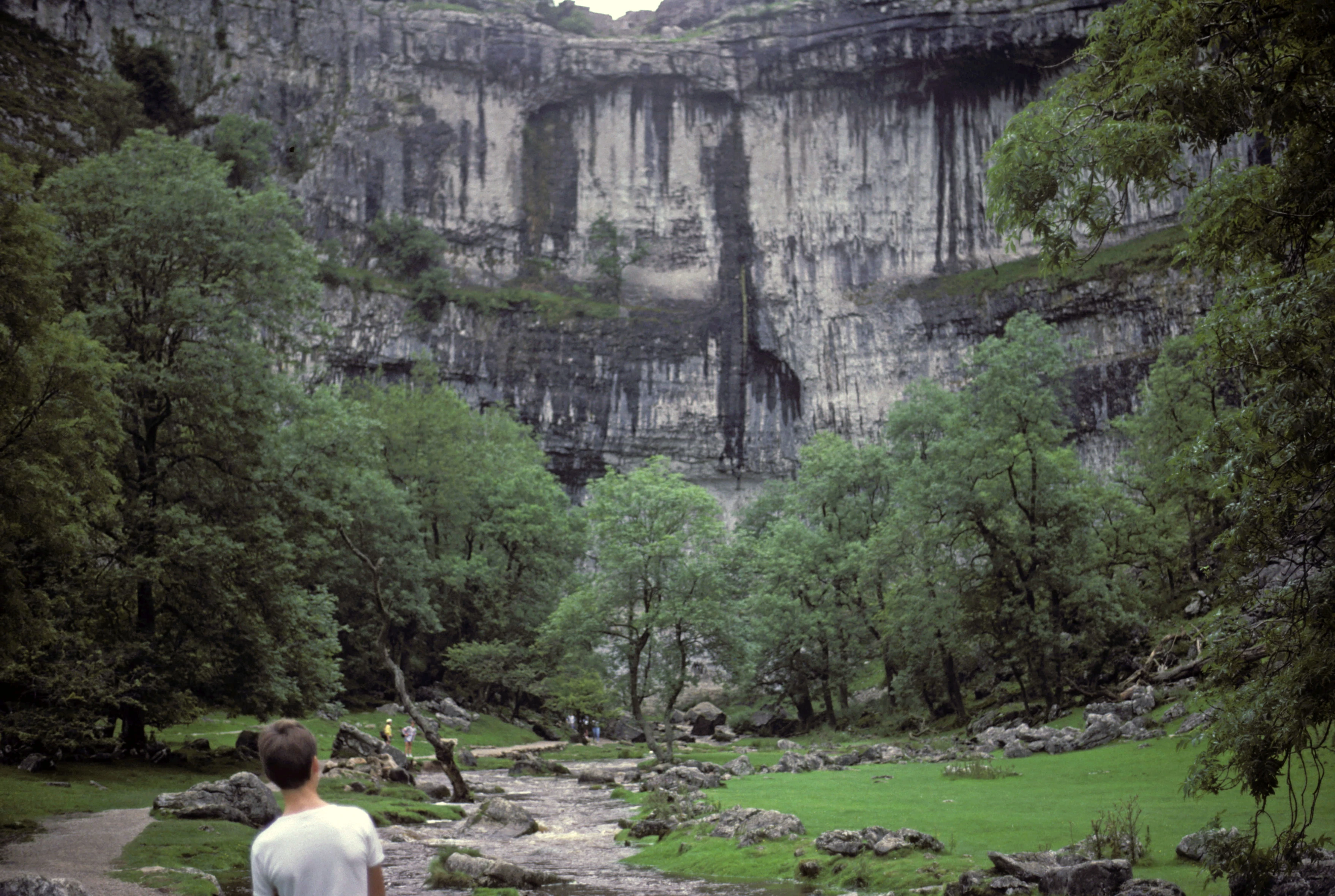 Approaching the sheer limestone amphitheatre of Malham Cove along the riverside path.