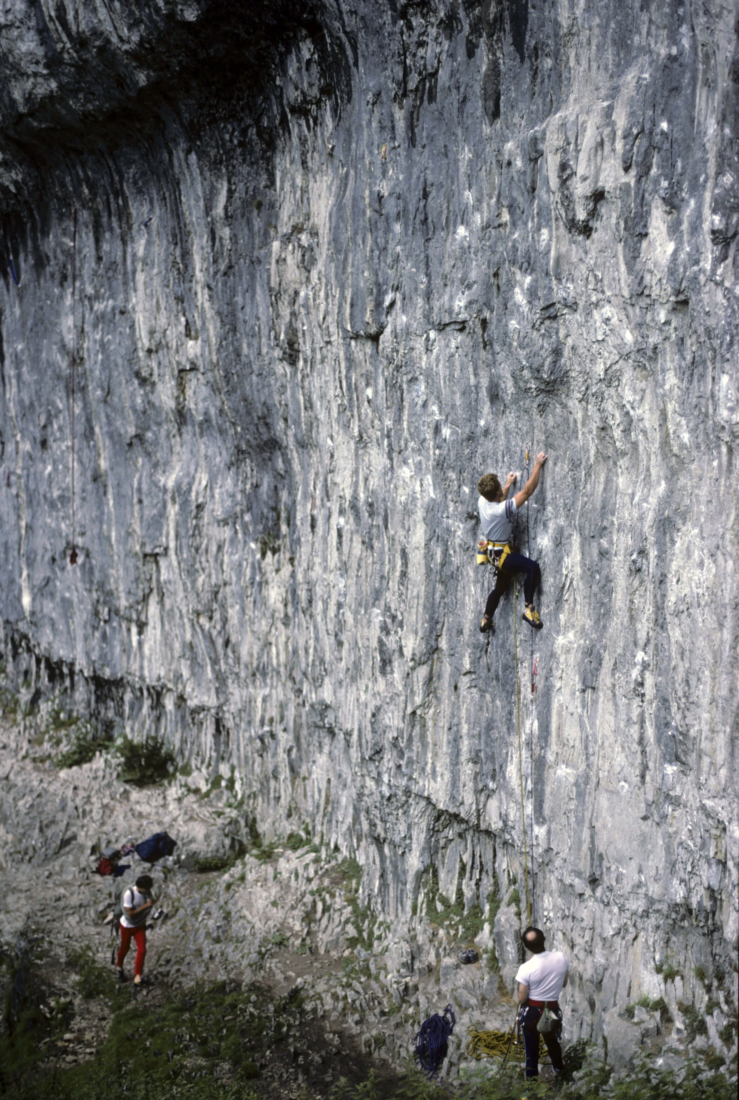 Rock climbers testing Malham Cove’s vertical limestone, belayers poised on the ledge.