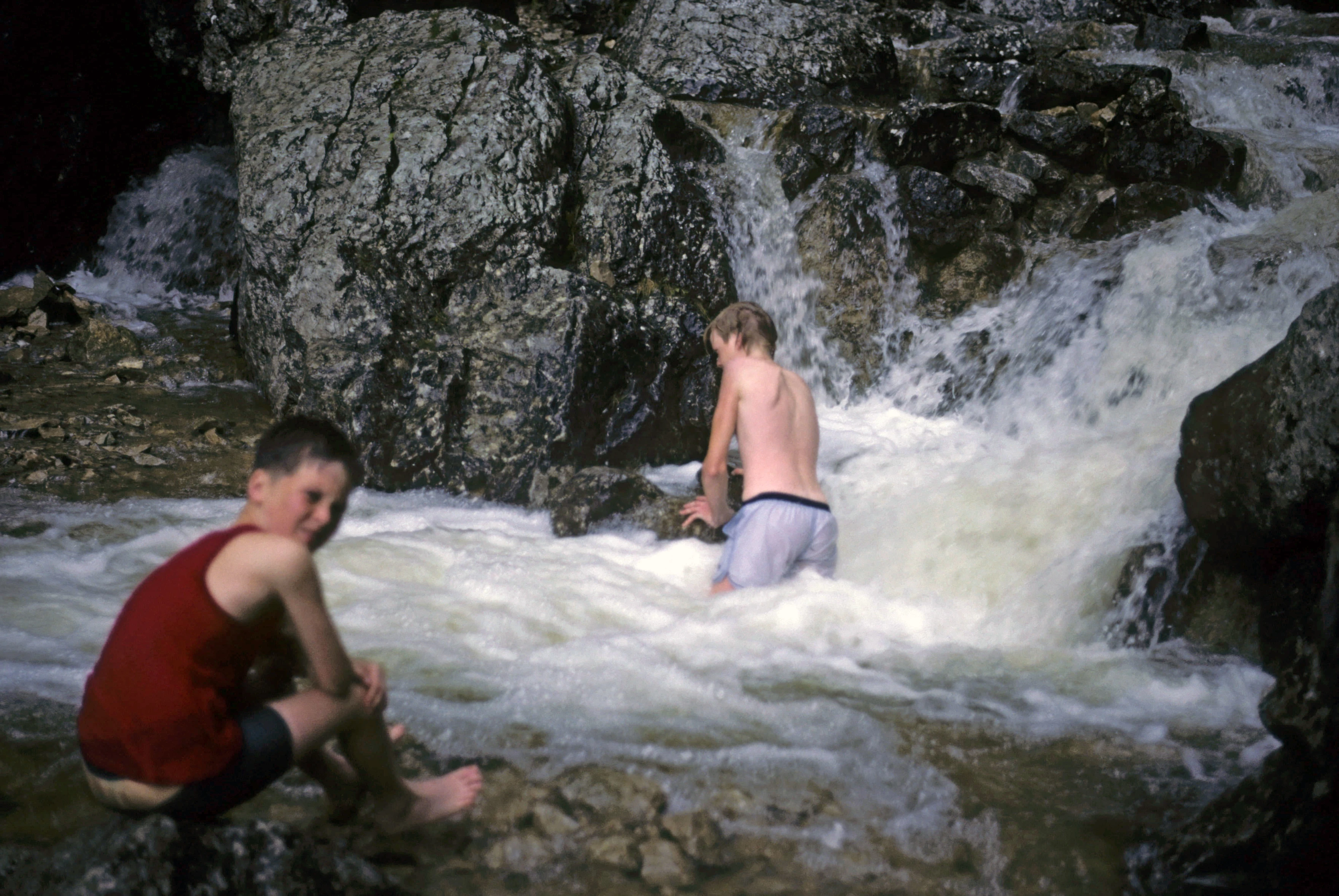 Aidan and Matthew Nunn brave the foaming plunge pool at Gordale Scar.