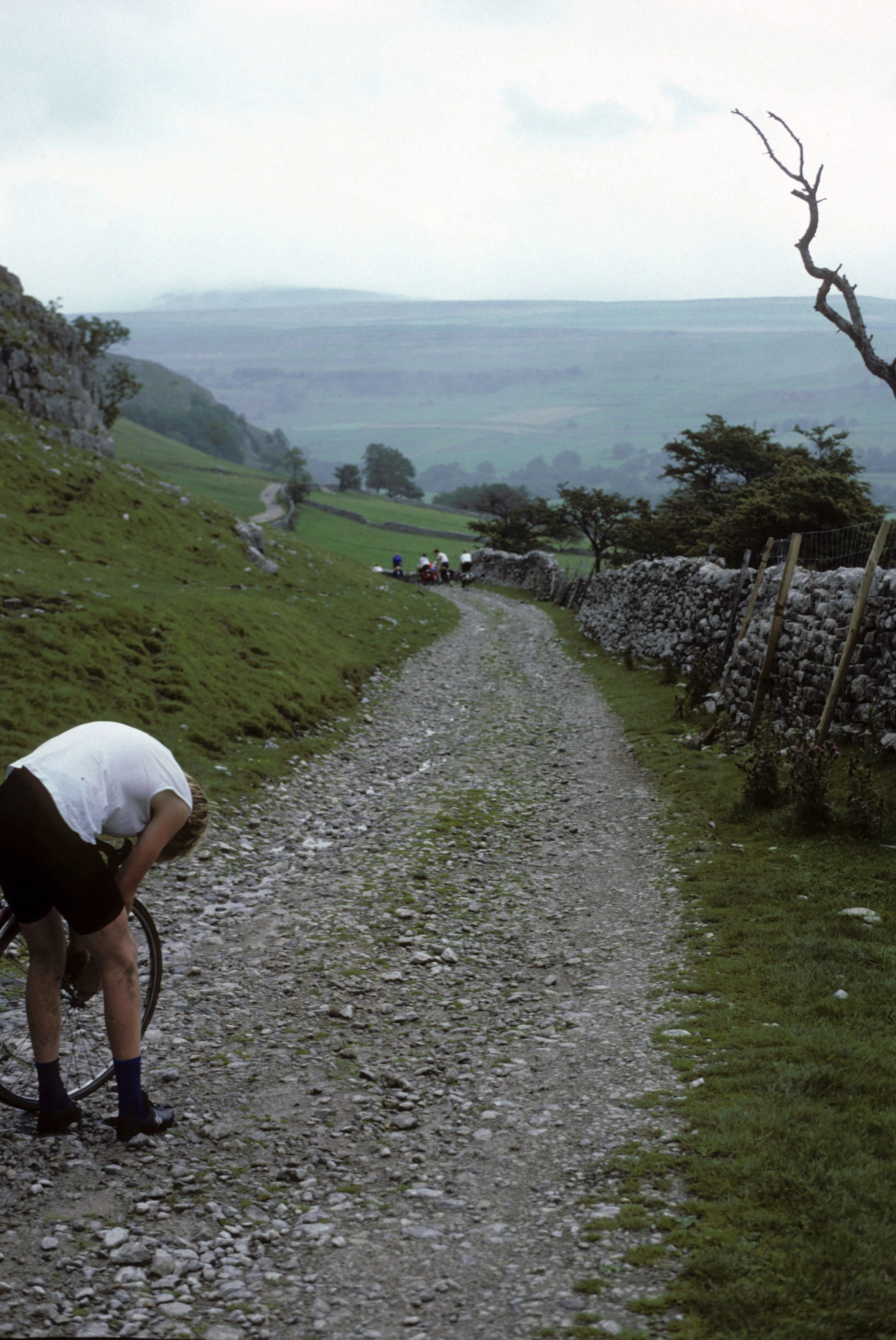 Rough, loose descent towards Kilnsey Crag; an untimely puncture in the foreground.
