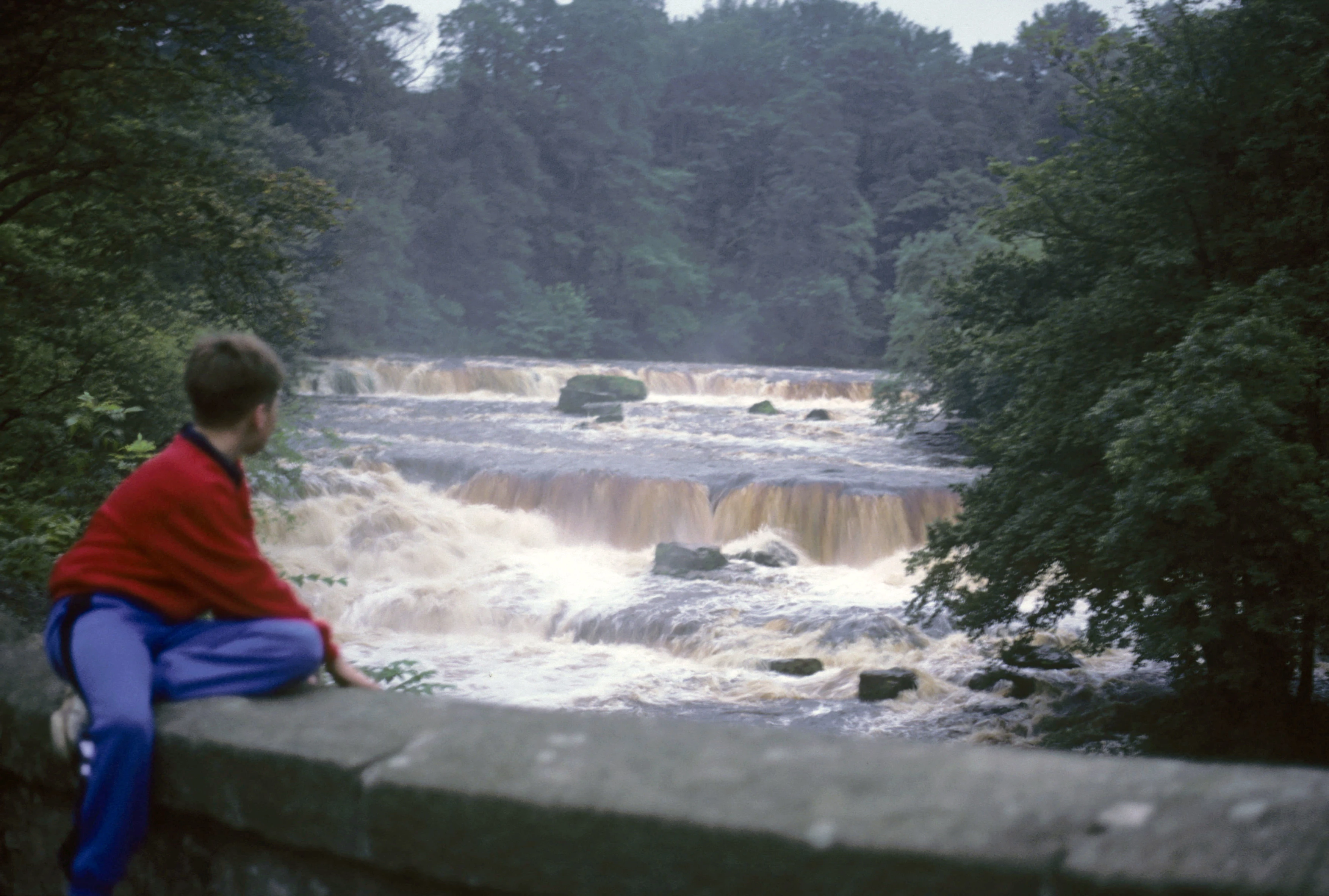 Aidan taking in the thunderous, tea-coloured torrent at Aysgarth Falls.