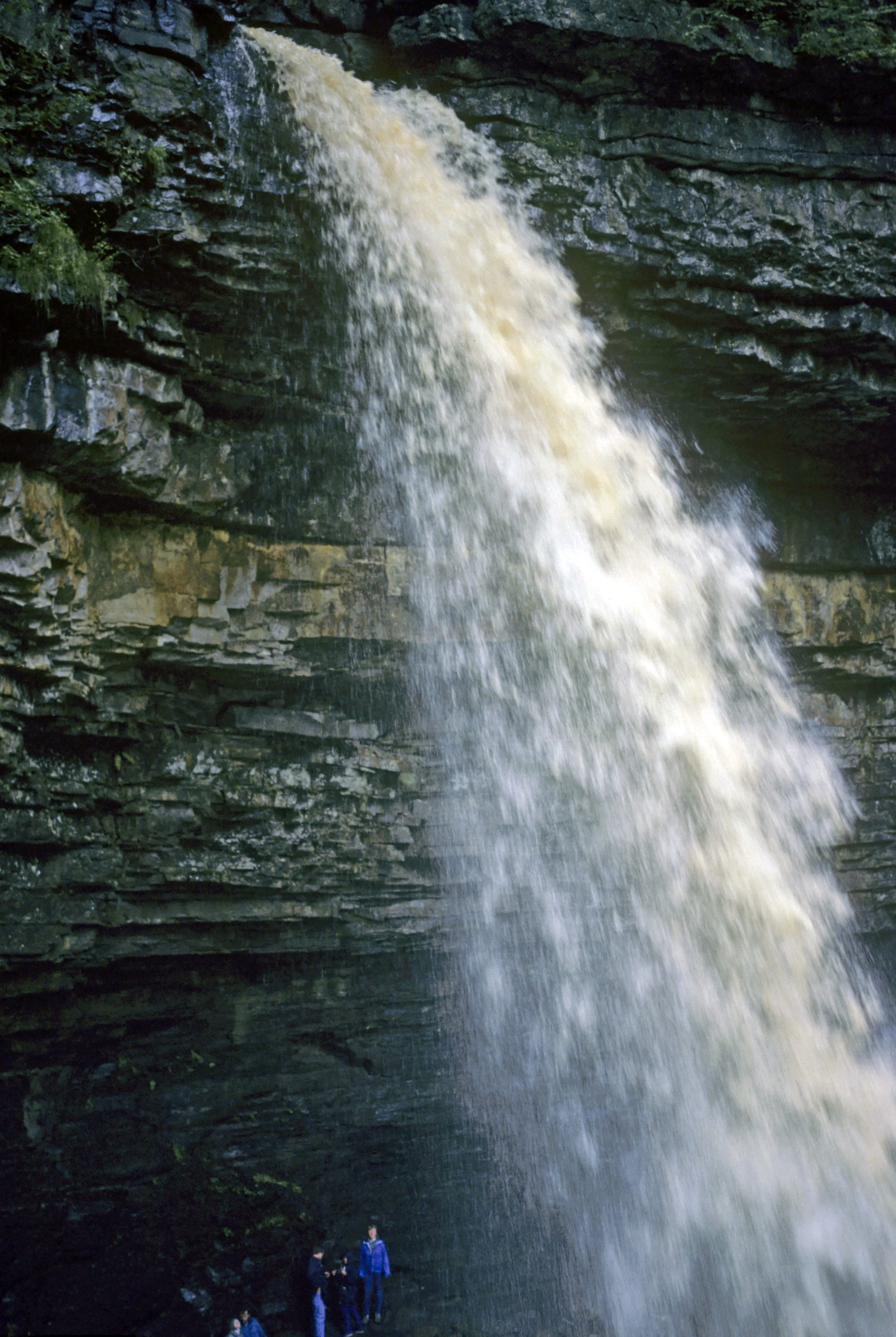Behind Hardraw Force on the narrow ledge, soaked by the roaring spray.
