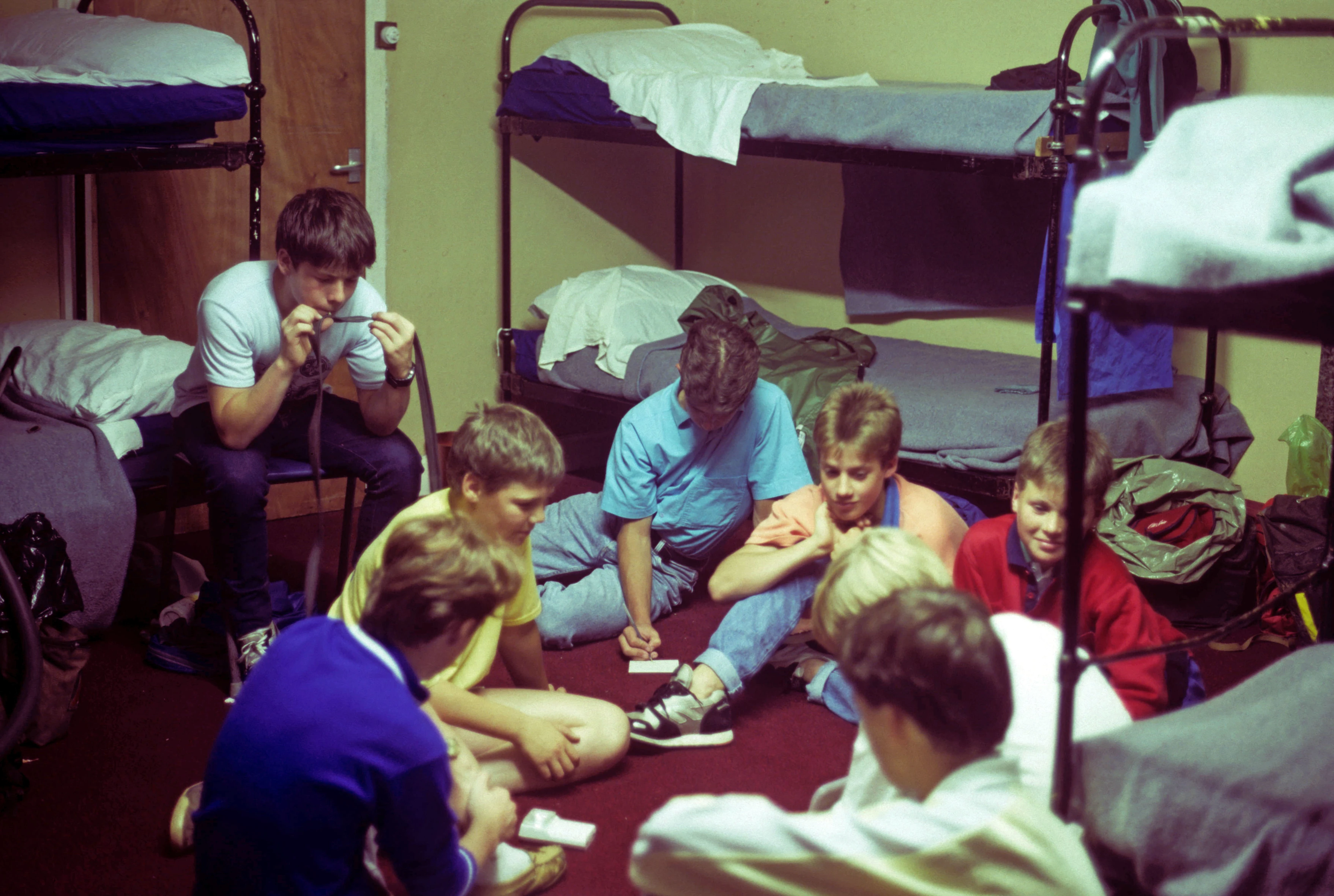 Liar Dice on the dorm floor—cosy bunkroom buzz after showers and supper.
