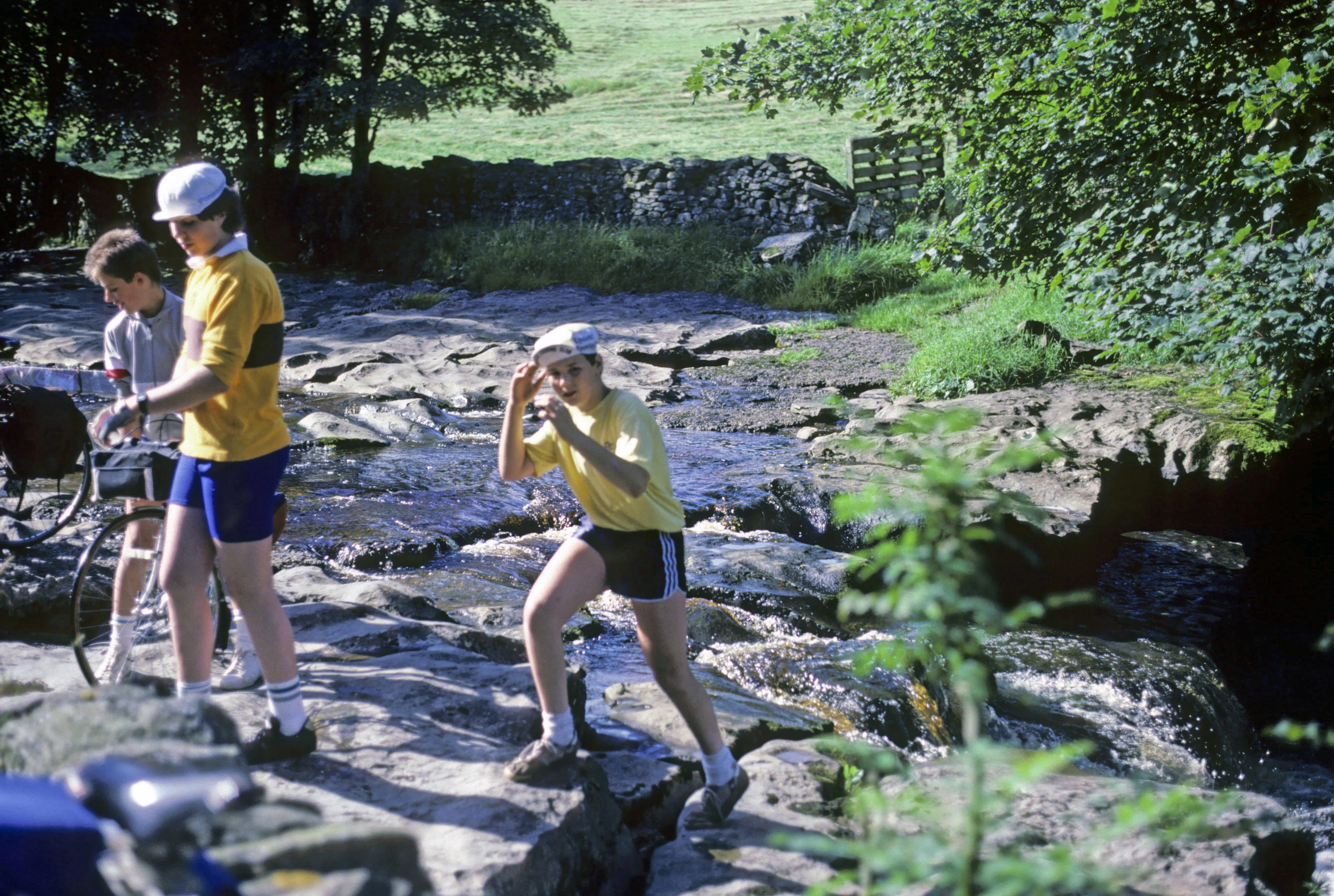 Brett, David and Stephen explore the limestone bed of the River Dee.