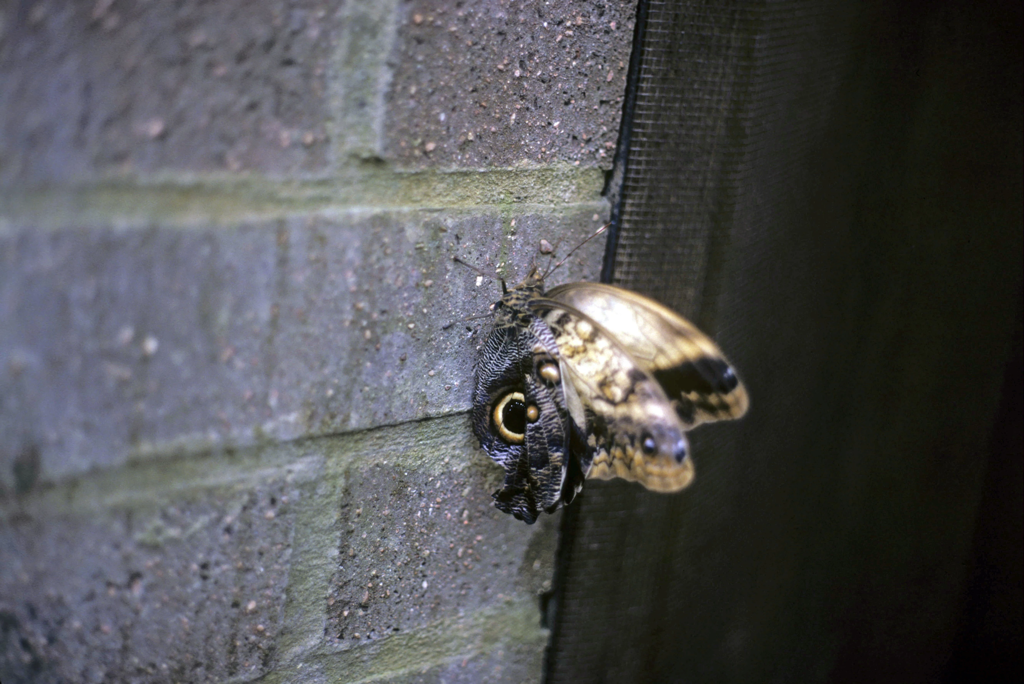 An Owl Butterfly resting on an inner wall at the New Forest Butterfly Farm near Ashurst.