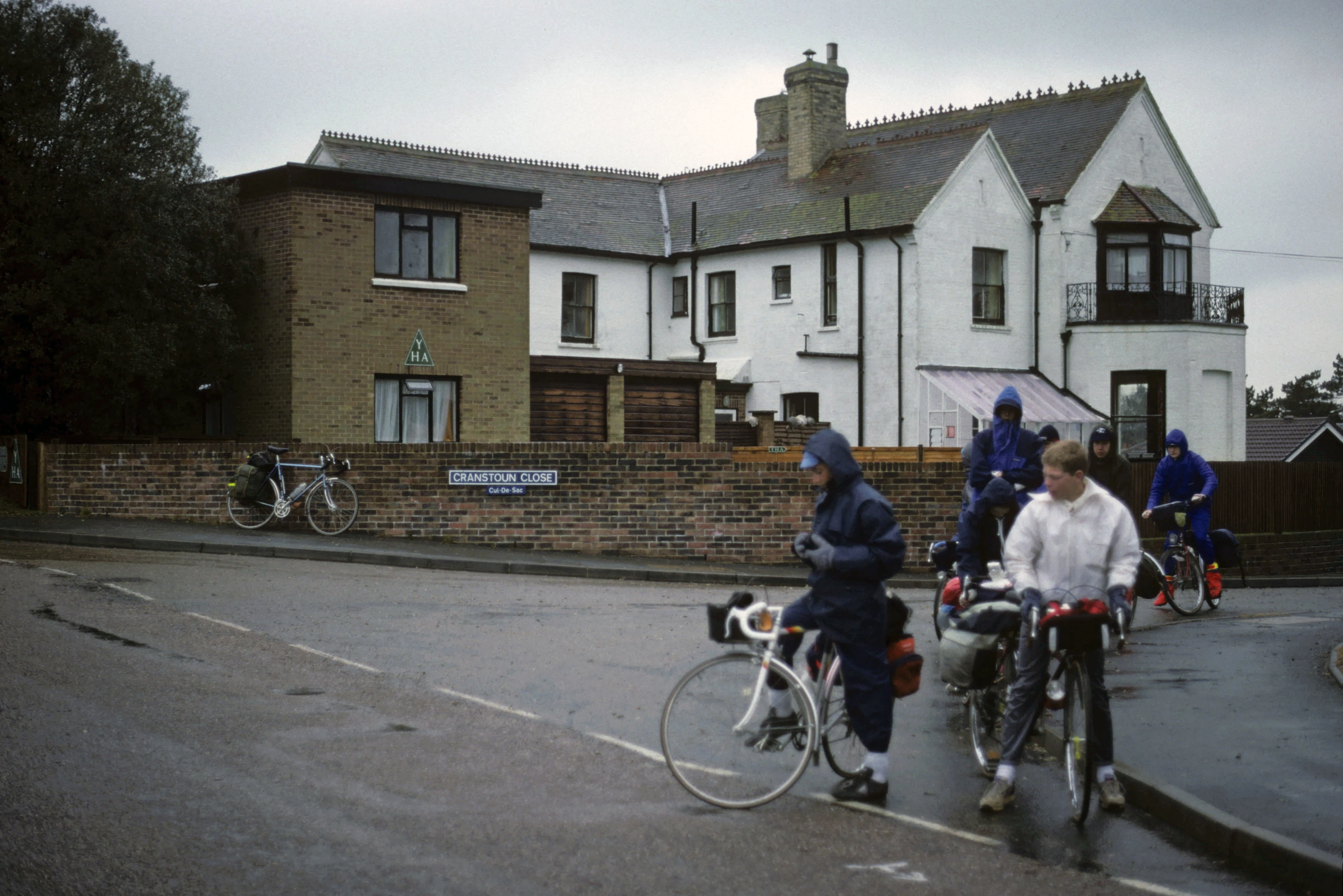 Leaving Totland Bay Youth Hostel in the rain after a morning of cards, chess and Scrabble.