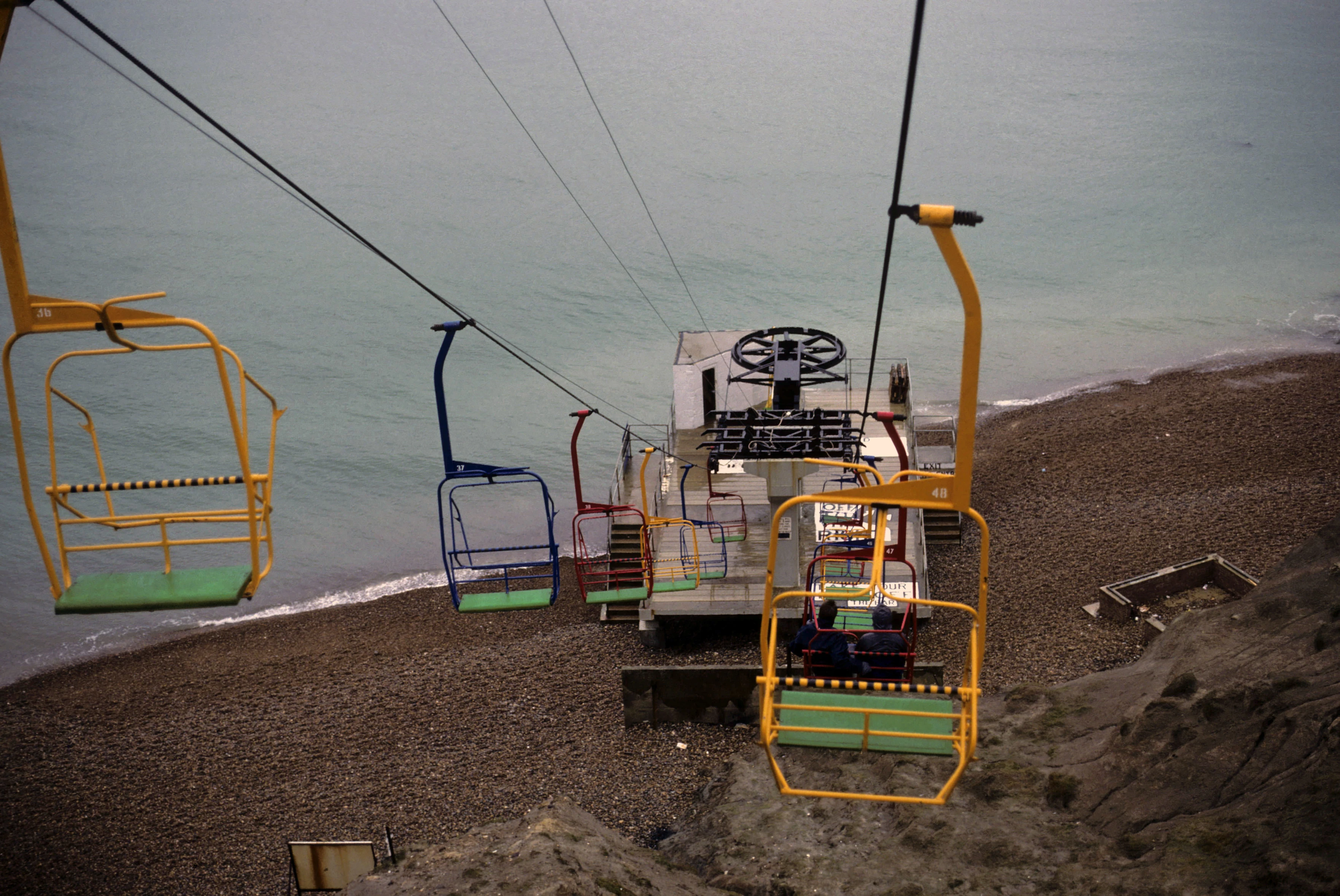 Descending to the beach on Alum Bay's colourful chairlift in light rain. Every other chair is empty.