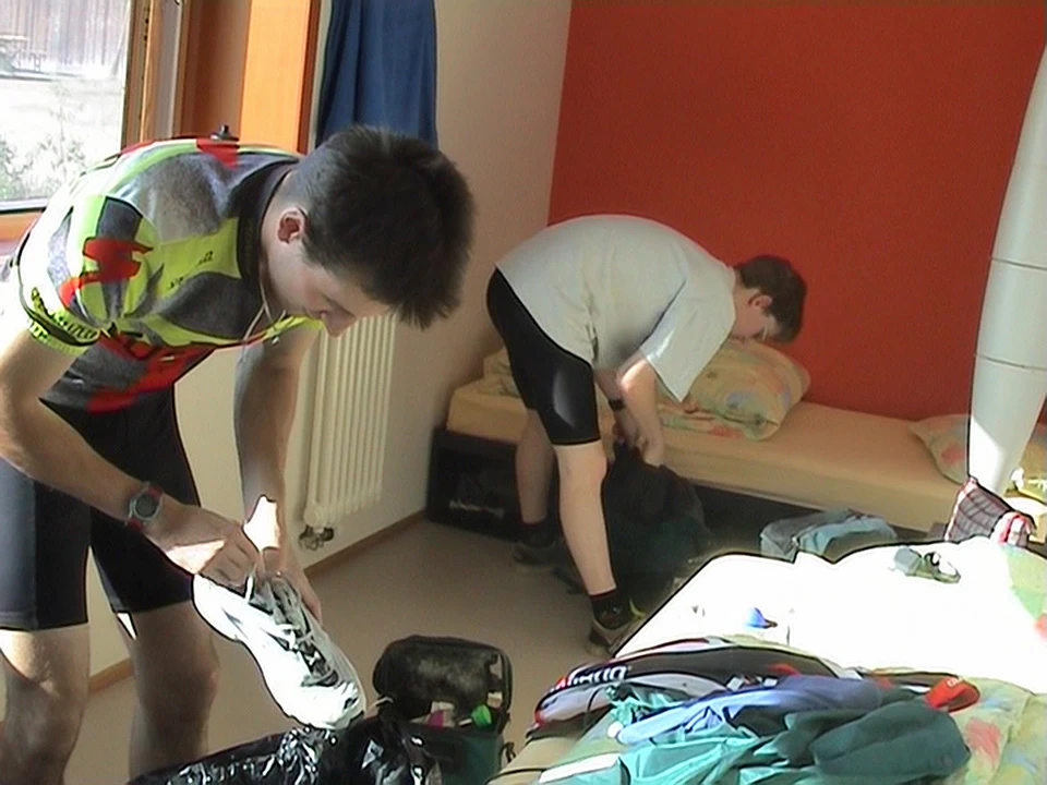 Packing panniers in our room at La Suage Hotel, Cudrefin.