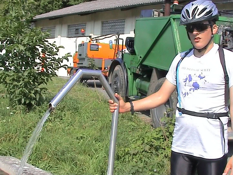 Luke at the very welcome farm fountain near Penthalaz, 44.4 miles in.