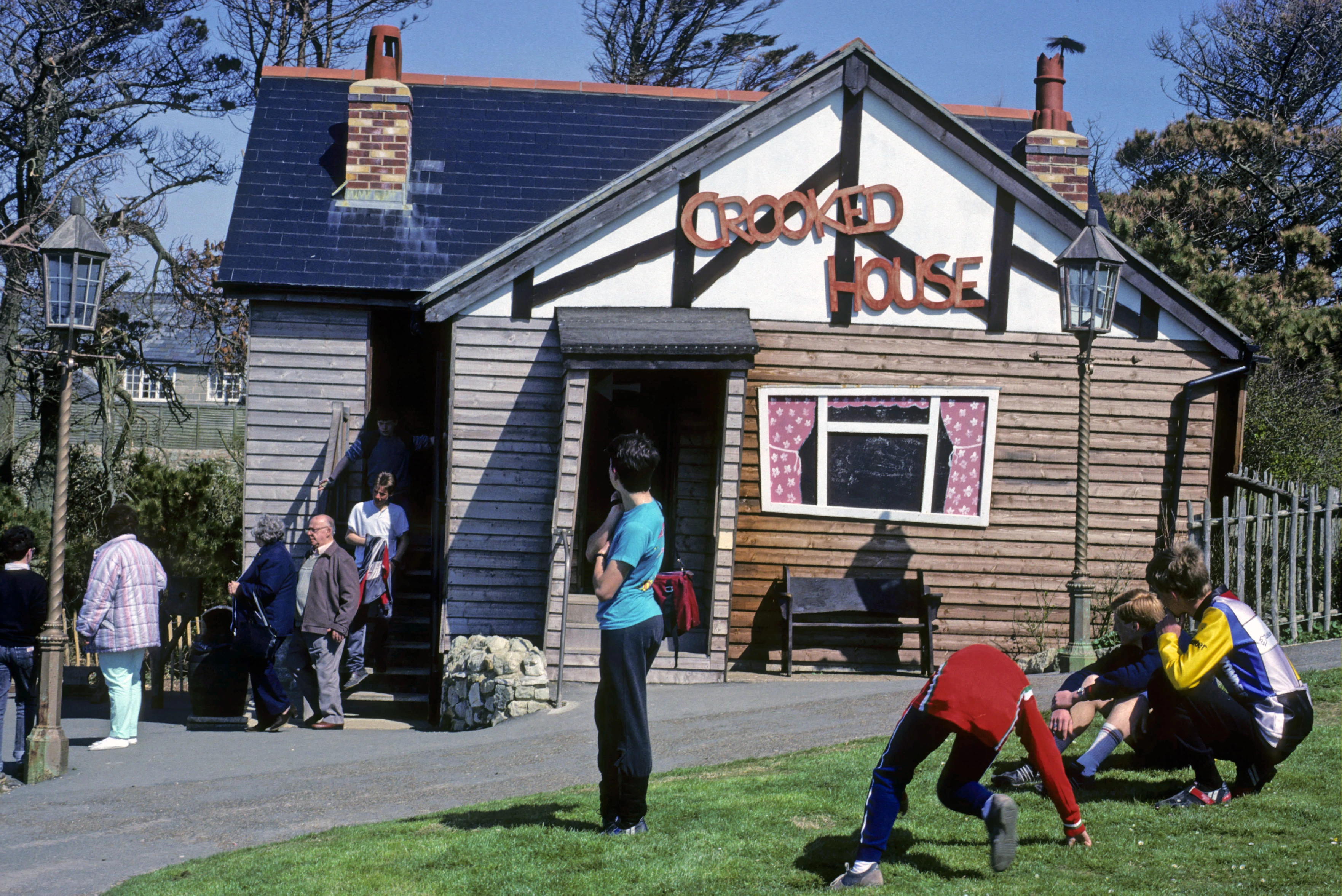 Brett and Gary exit Blackgang Chine's Crooked House; Graham, Paul, Mark and Richard wait in sunshine.