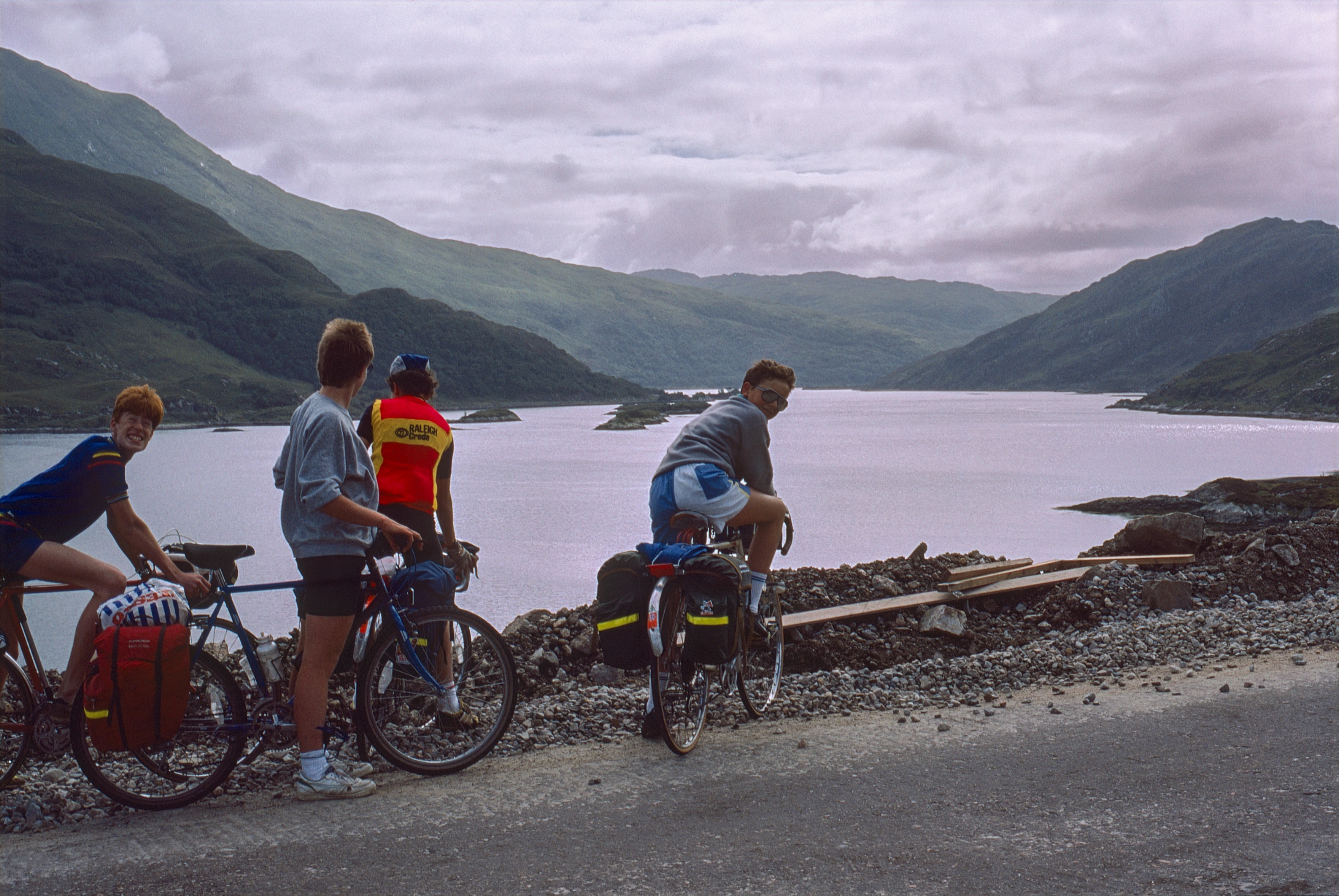 Philip, Andrew, Jason and Mark on the A830 at the head of Loch Ailort. Classic west coast vistas, 30 miles in.