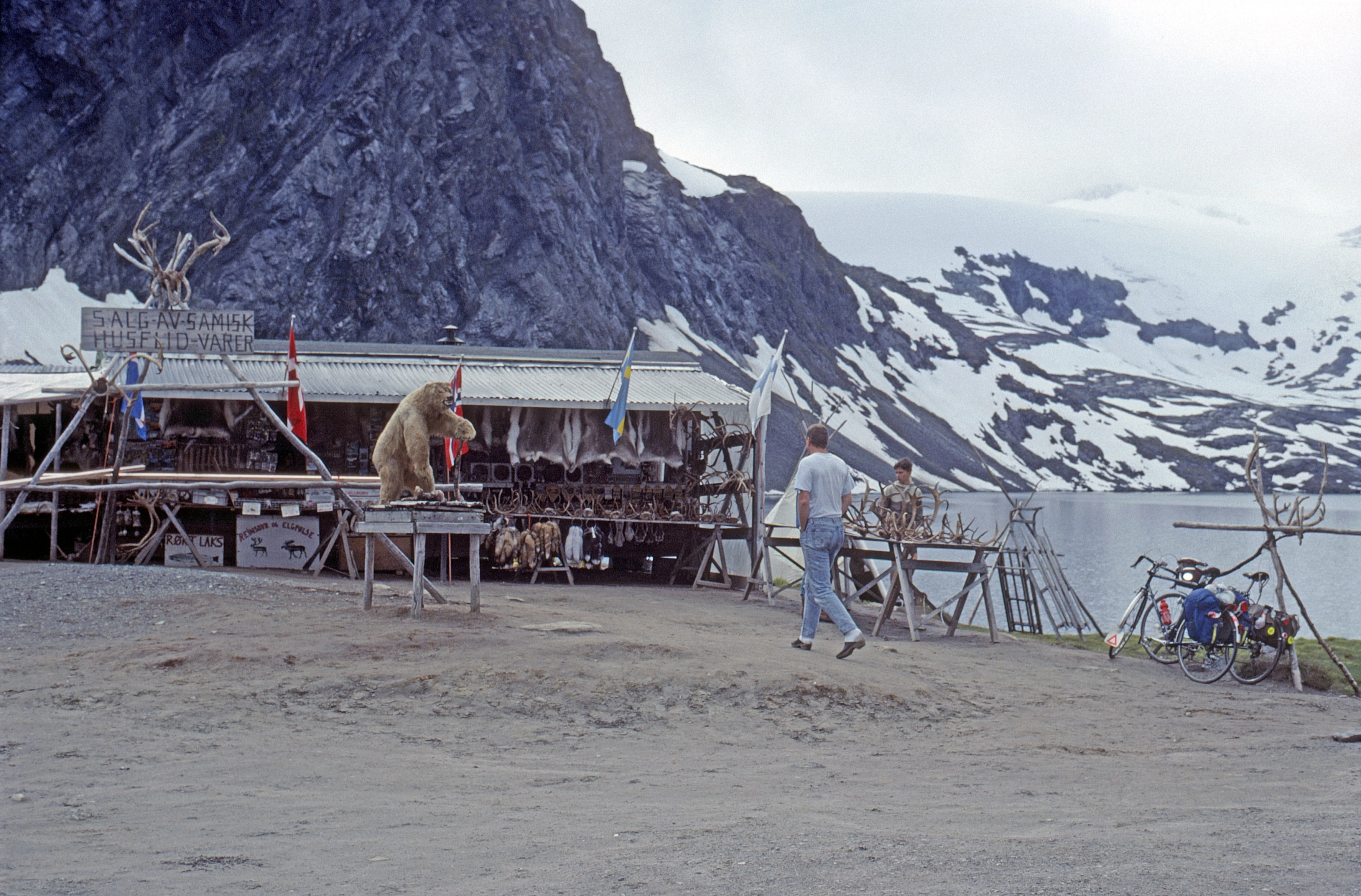 Sámi roadside stall by eastern Djupvatnet: reindeer hides, antlers and a stuffed bear.